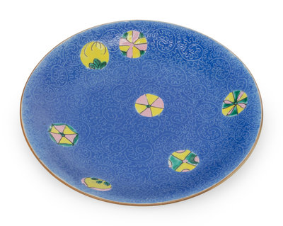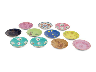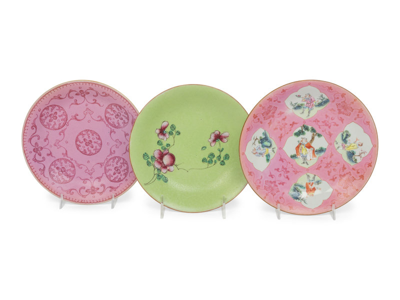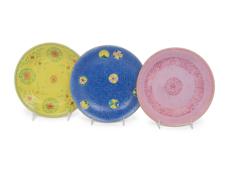 each having a shallow cavetto supported on a short foot, variously decorated with floral sprays, dragons, and figures.