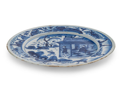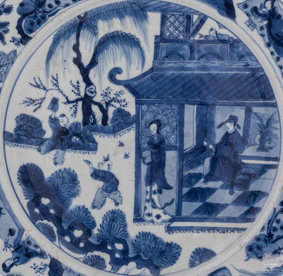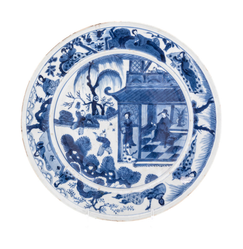 the central rounded enclosing a garden scene showing a couple in a pavilion, gazing at two boys playing in a garden, the border painted with Chinese beauties at various tasks in gardens, the reverse with floral sprigs.