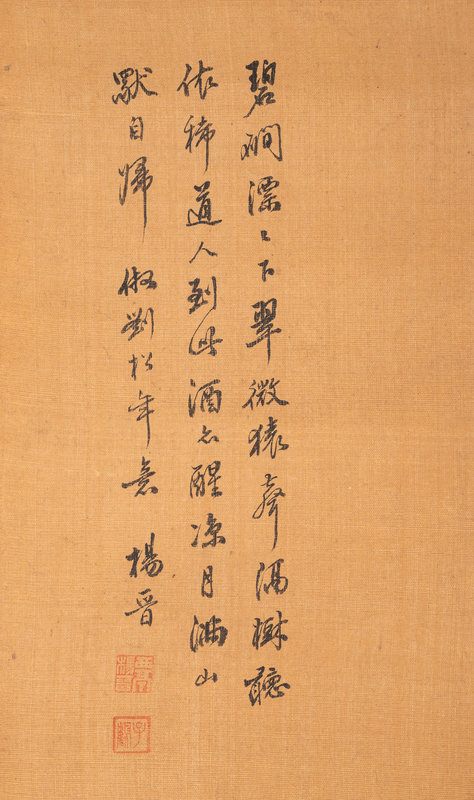 款識:碧澗漂漂下翠微,猿聲隔樹聽依稀。道人到此酒亦醒,涼月滿山獨自歸。仿劉松年意,楊晉。