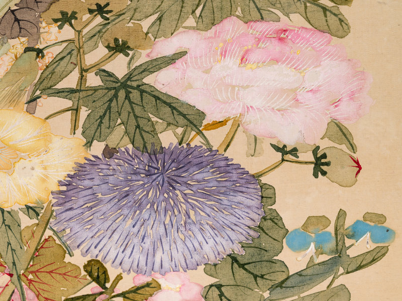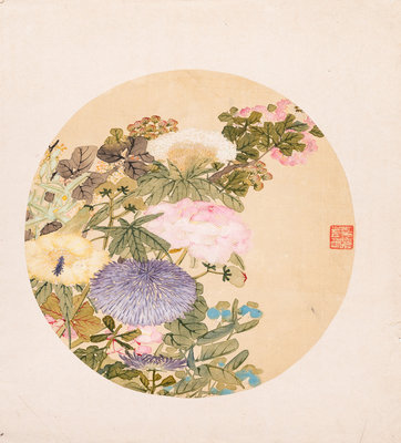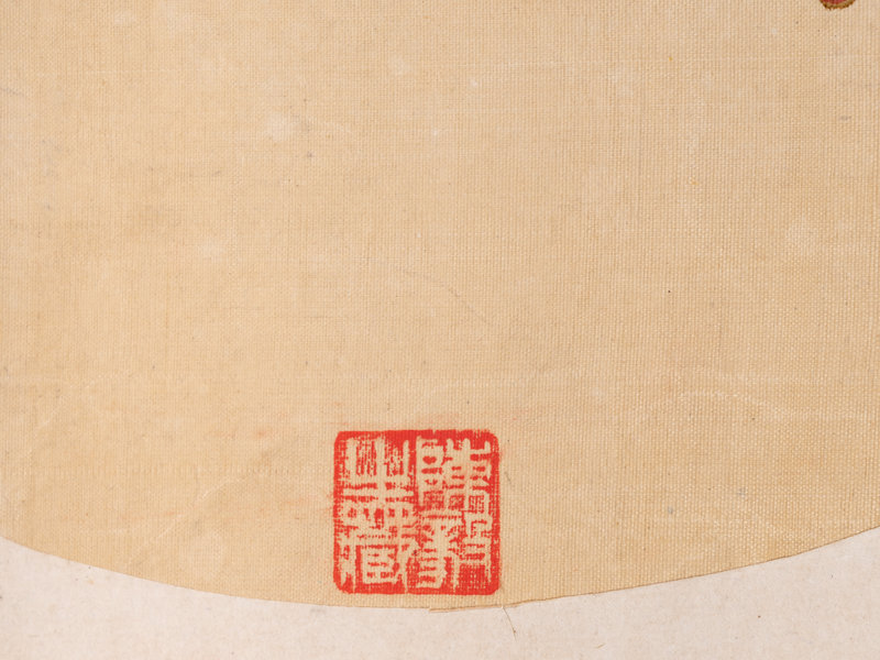 ink and color on silk, rounded fan leaf
