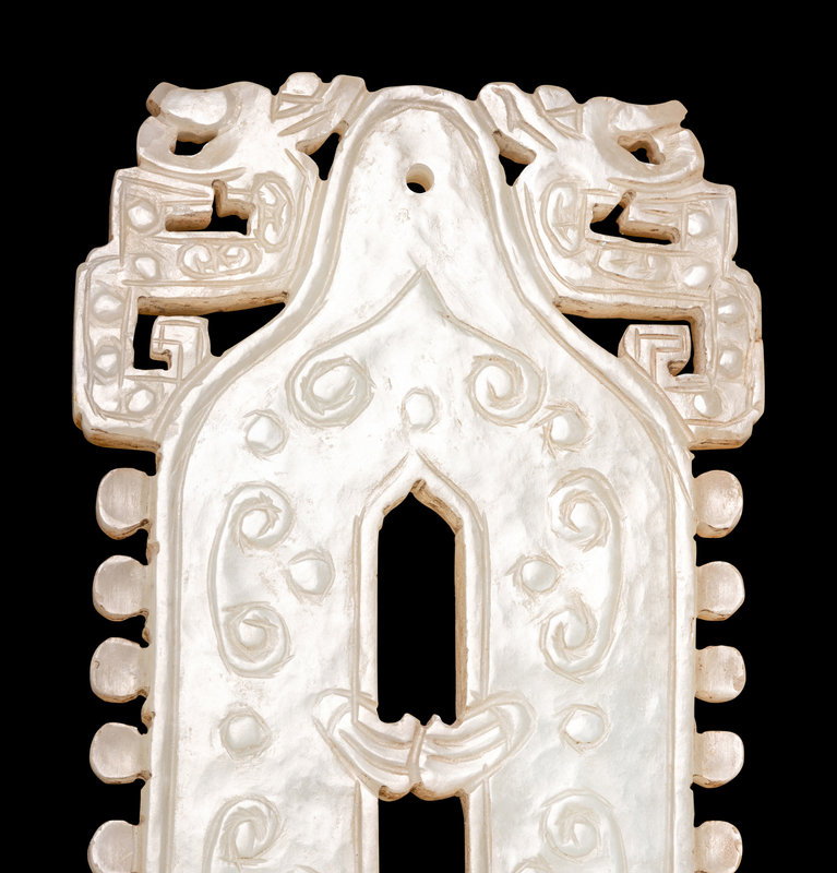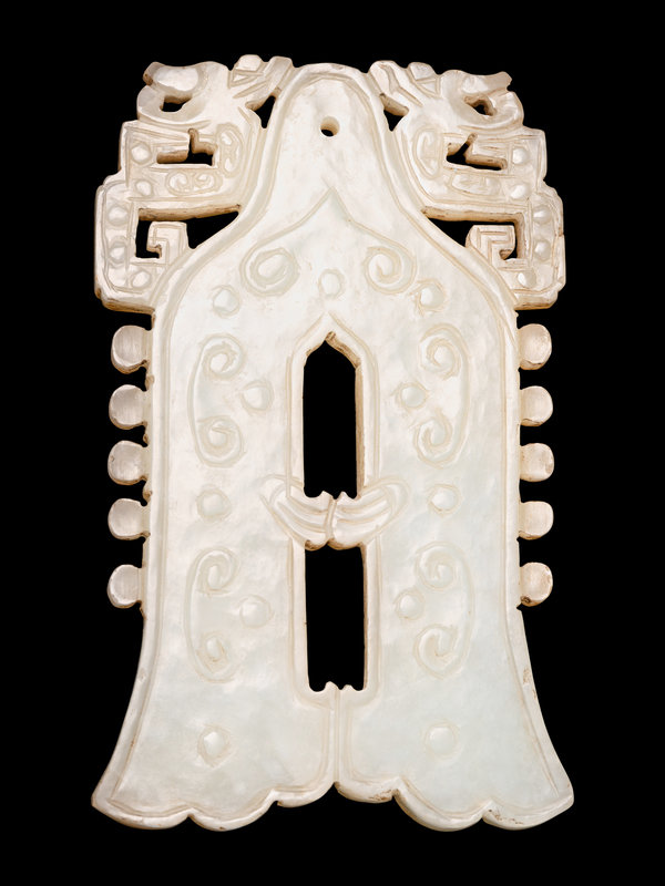 the celadon stone having minor white inclusions, the reticulated bell-shaped pendant incised with c-scrolls, flanked by a pair of confronting dragons above a row of relief carved circular tabs.