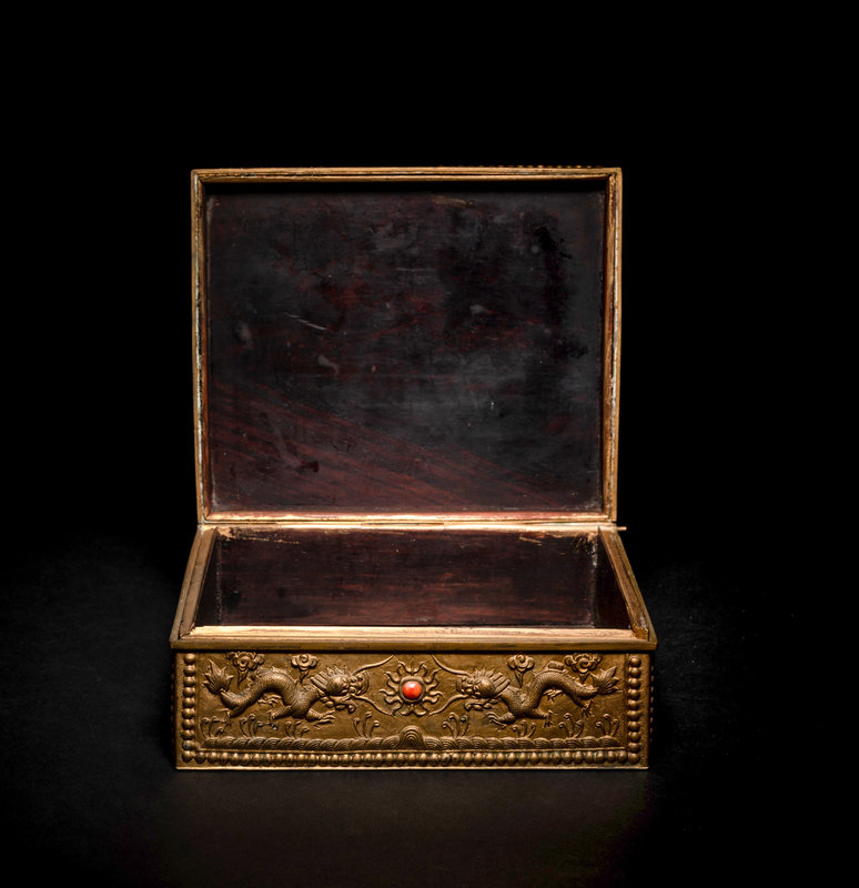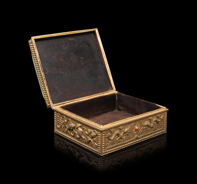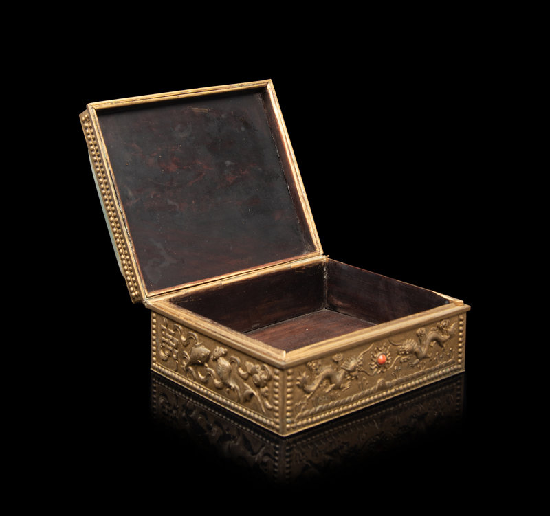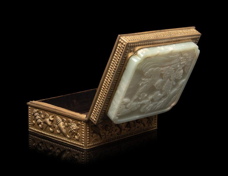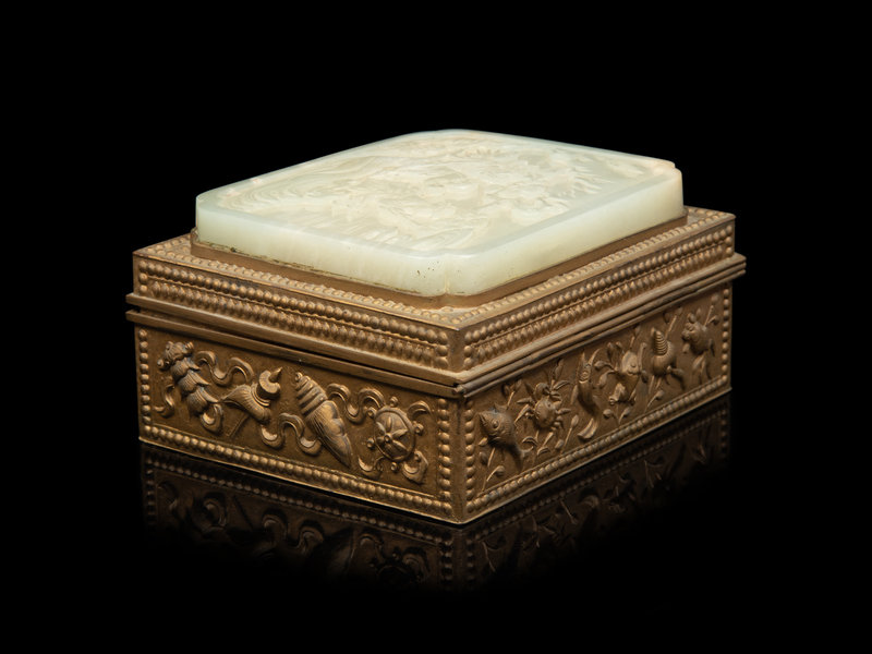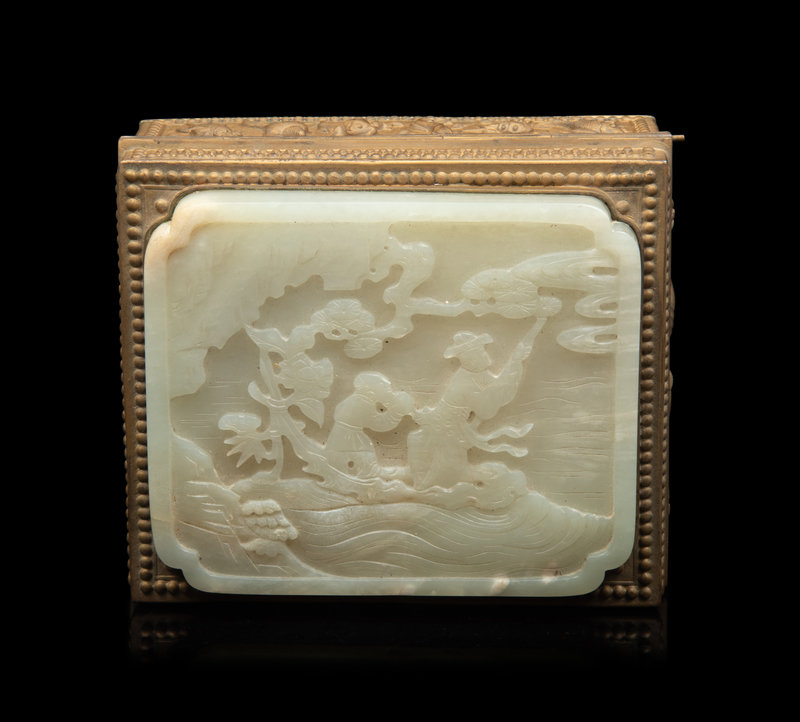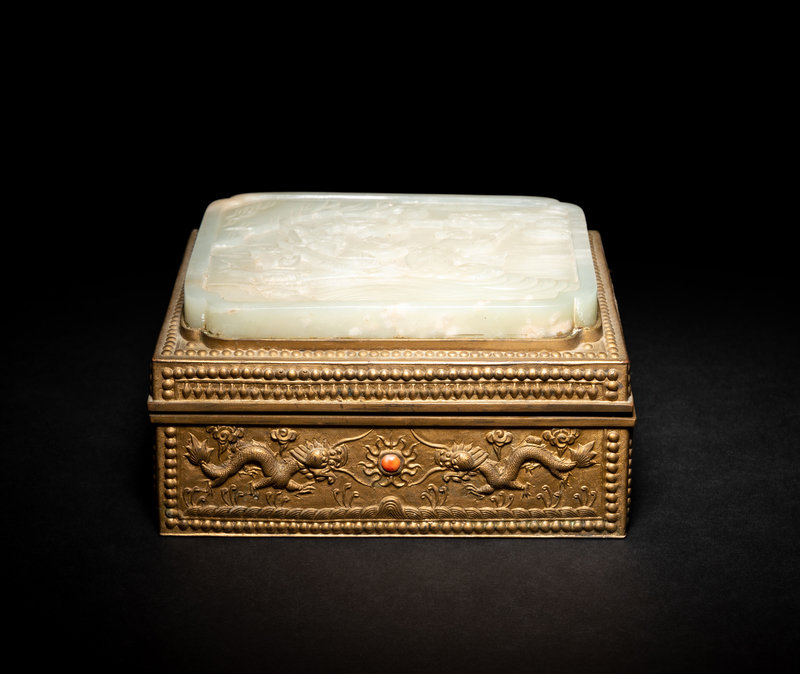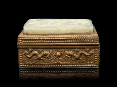 the hinging box and cover chased with auspicious symbols about the sides, flanking a pair of dragons in confrontation across a coral-inset flaming pearl. The top set with a celadon jade box of rectangular form with chamfered corners, worked in laminated relief to show figures in a boat crossing turbulent waters.