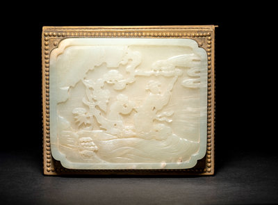 清晚期 銅鑲仙人乘槎青玉牌方盒