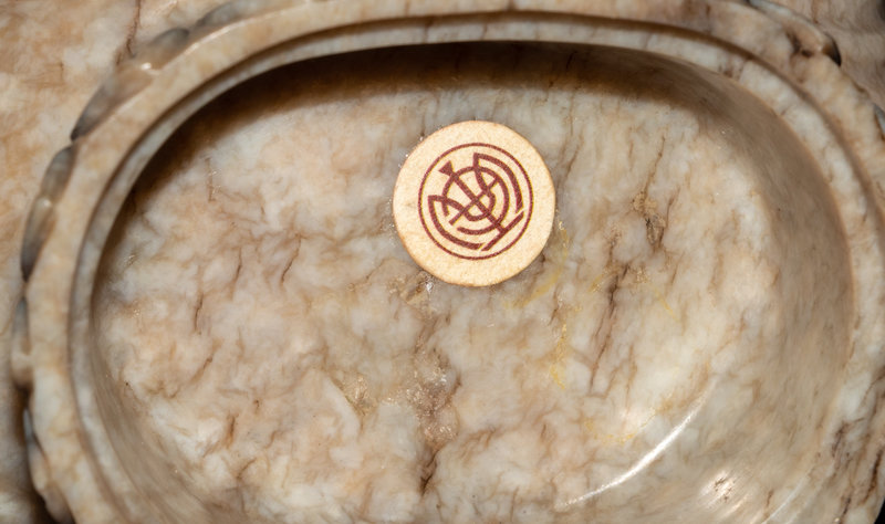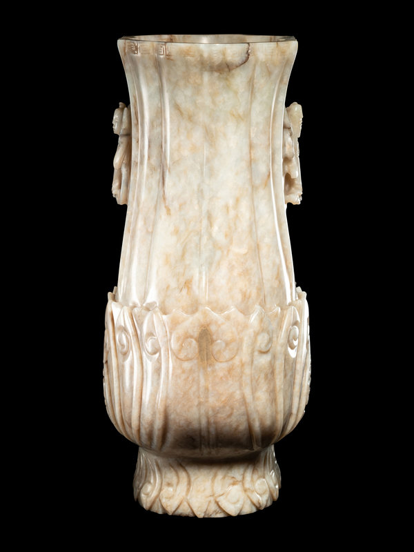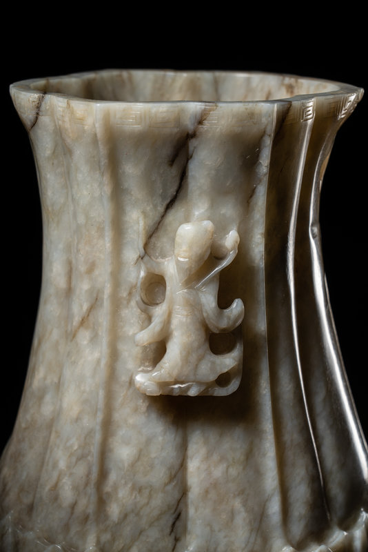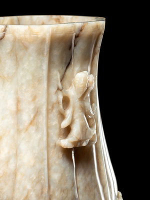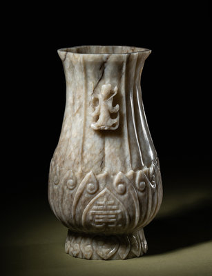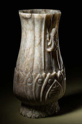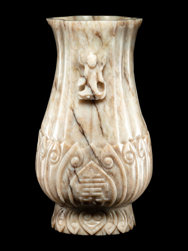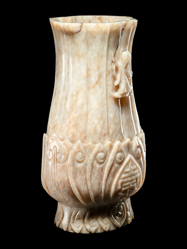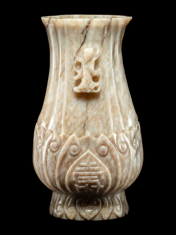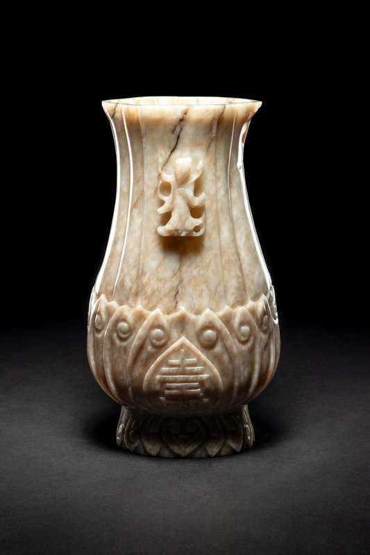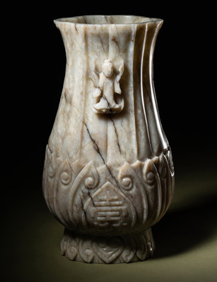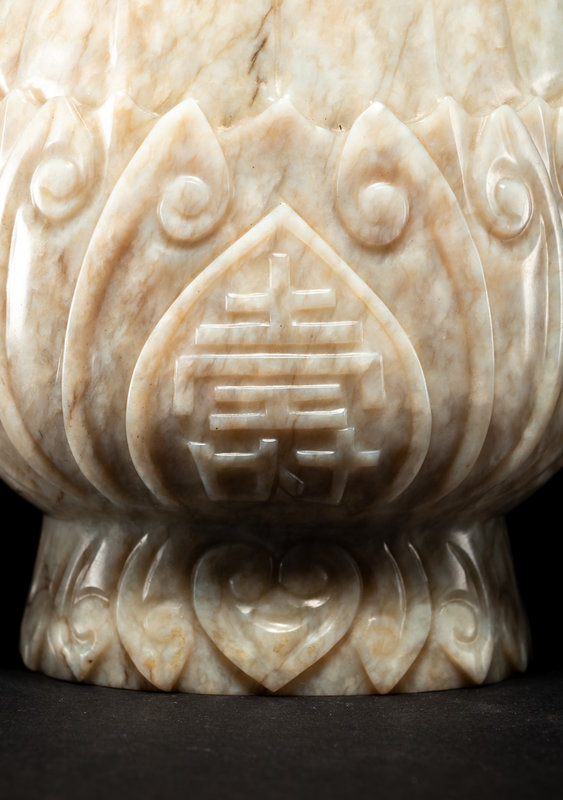 carved from stone of pale oatmeal tone charged with ripples of grey and ruddy striations to compressed bell-form with a slightly flaring mouth. The ovoid foot carved to the exterior with lobes of pointed lotus spears scaling the body, worked over at opposing long sides with shou characters in en suite roundels, above which the lobed body continues in lower relief beneath figures of immortals, terminating in a foliated mouth rim, and incised at the lip with a keyfet band.