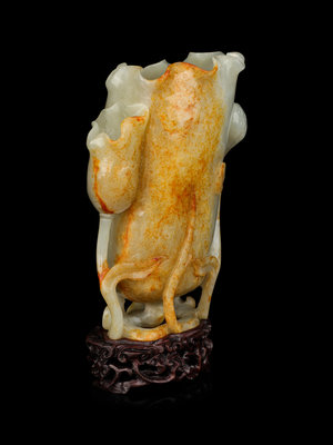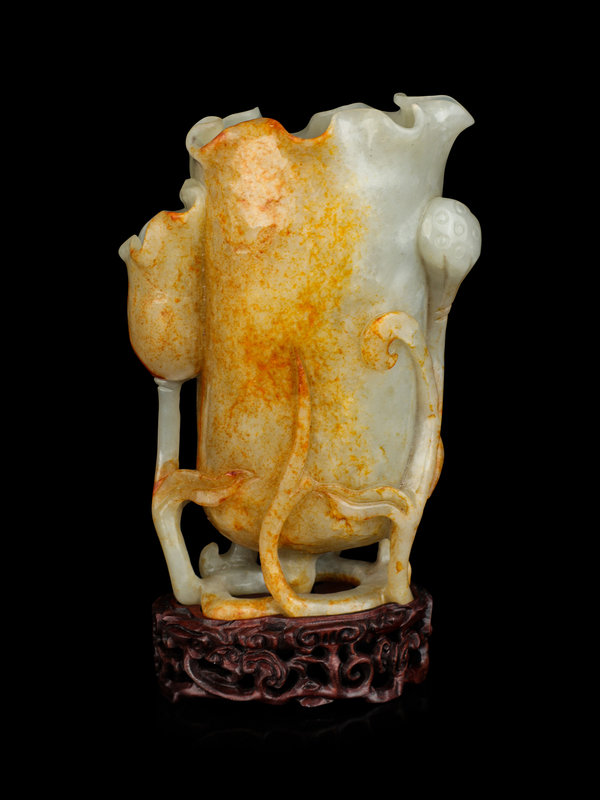 the even colored stone with russet patches, carved in the shape of a furled upright lotus leaf with a smaller lotus leaf and two lotus pods, raised above curling stems forming the integral openwork base, further set atop a fitted hardwood stand carved with openworked lingzhi fungus.