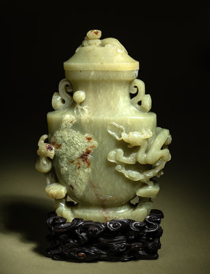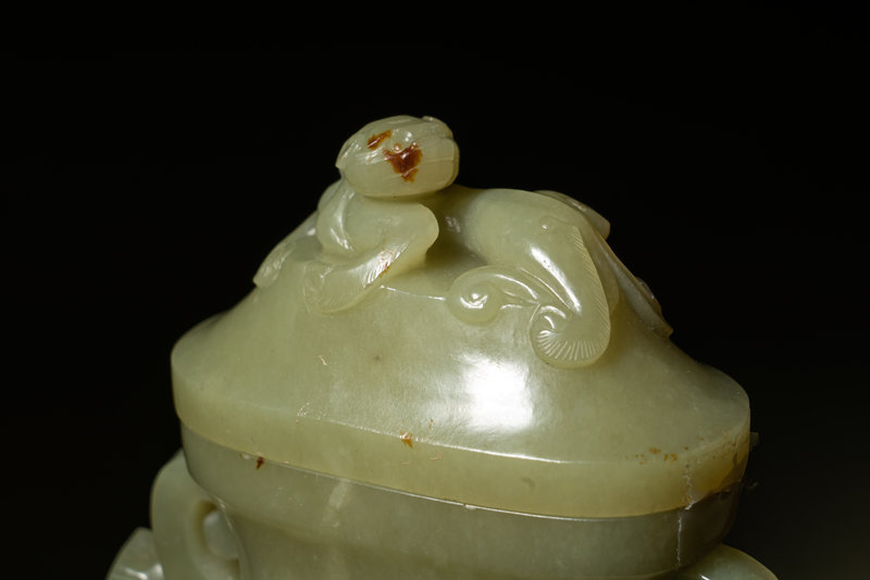 of flattened baluster form, naturalistically carved in the round with a dragon cumbering on one side, the domed cover surmounted by a chilong finial, the stone of a pale yellowish-celadon tone, softly polished.