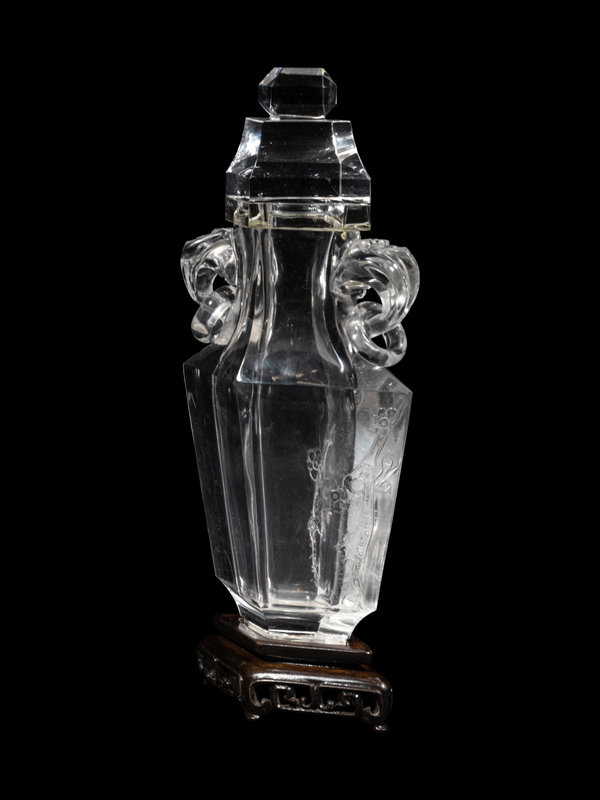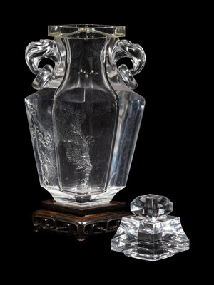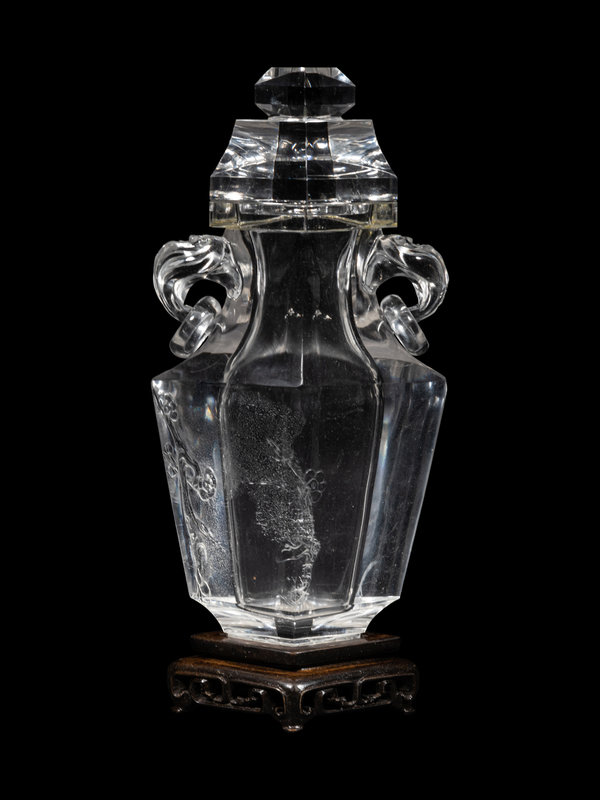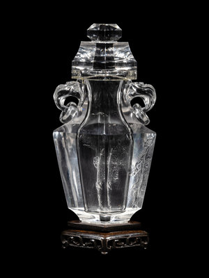 of compressed hexagonal form, with interior hollowed to a baluster shape and exterior delicately worked with lingzhi sprays. Flanked to the short side with mythical beast handles supporting rings; the conforming faceted cover terminating with a finial, and all raised above a hardwood stand.