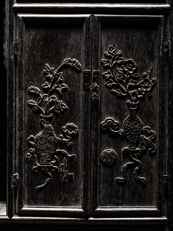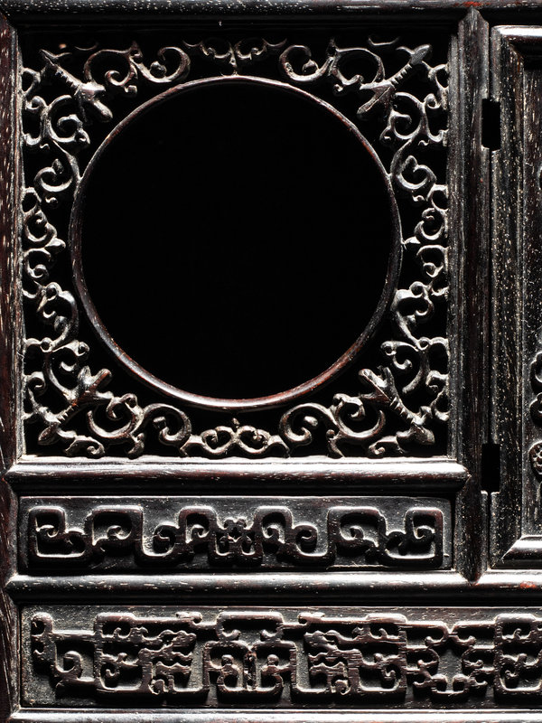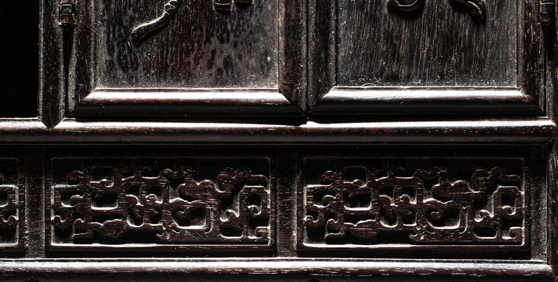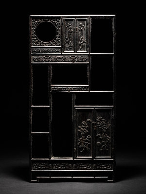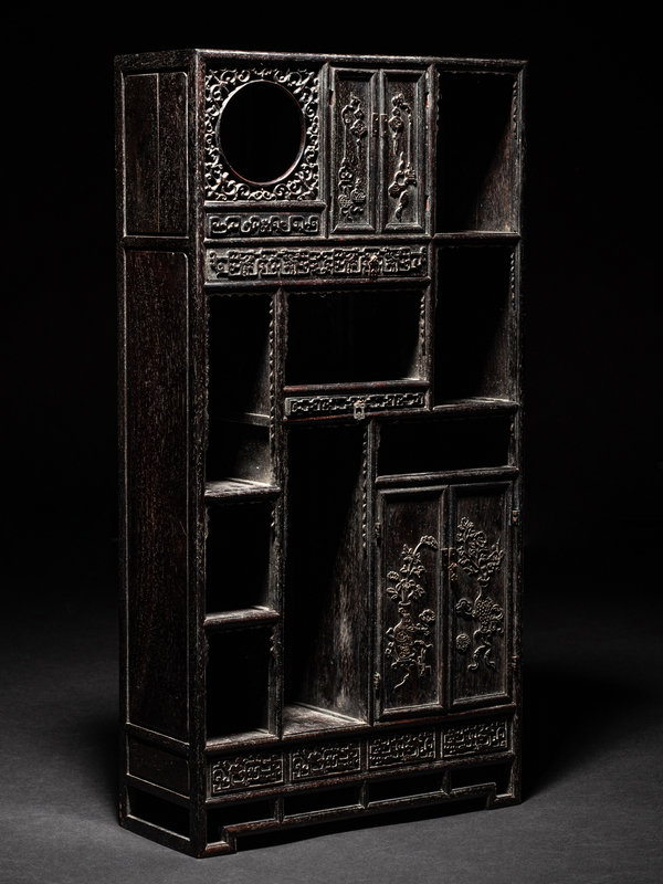 the wood of deep tone, carved to in rectangular form, raised on four low rectangular feet. The front face worked with numerous open rectangular shelves, one pull out drawers, one with a circular aperture, and two with hinging doors, carved in relief with various archaistic scrolls and floral motifs.