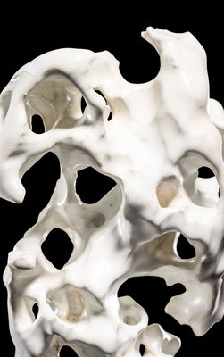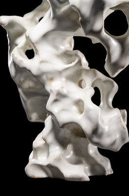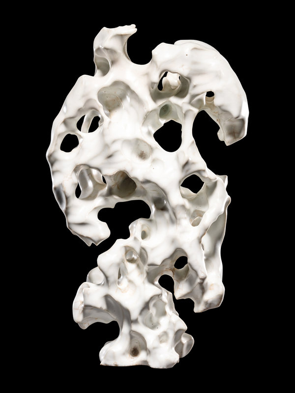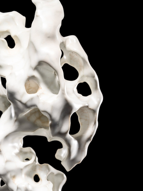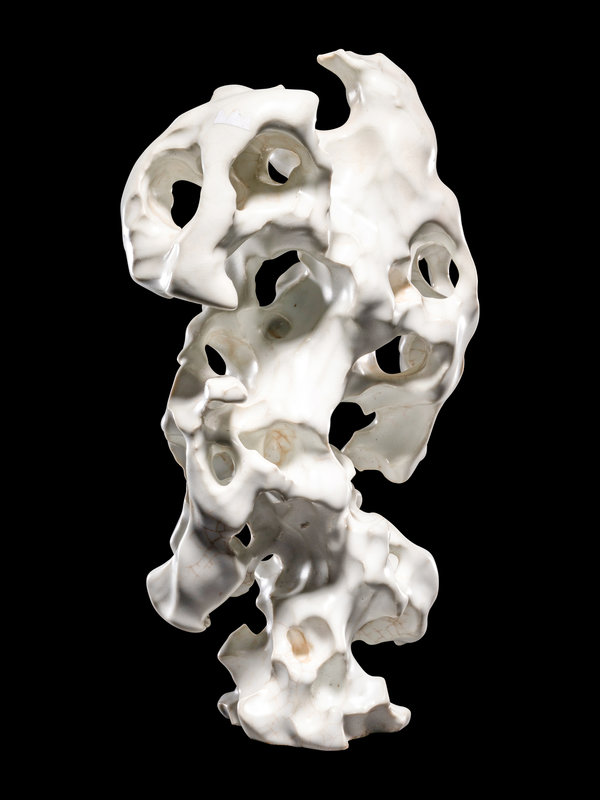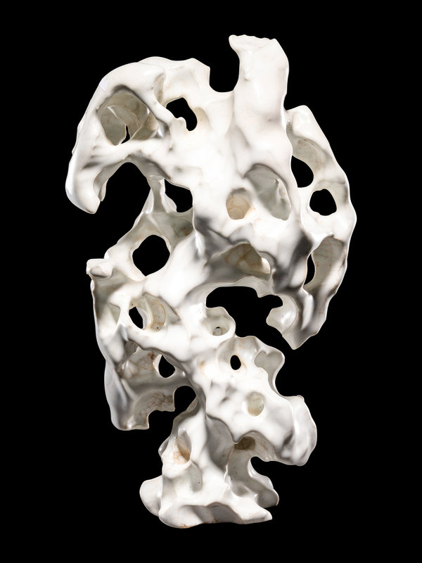 molded with cavernous apertures and undulating curves suggesting the contours of weathered stone, covered in white glaze thinning and jagged edges.