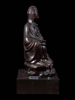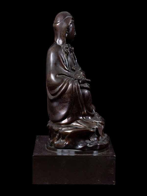 finely cast showing the figure posed upright with one leg gathered beneath bent knee supporting hands drawn to clasp a small scroll, all above a rocky base with a smaller peak elevating a bottle vase, the whole elevated on a rectangular plinth. The figures hair cascades down towards elaborate beaded jewelry, and fluid robes inlaid with delicate silver wires with wisps of cloud scrolls.