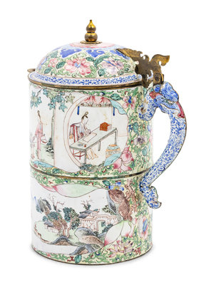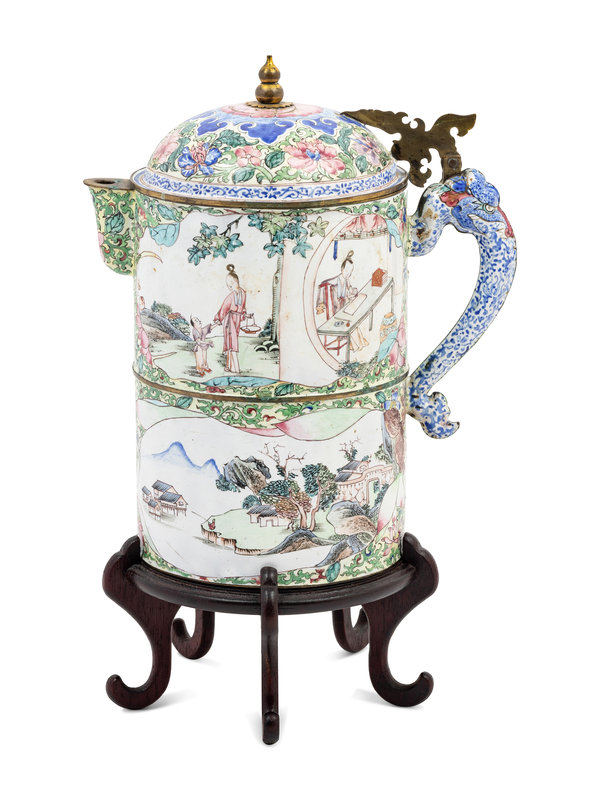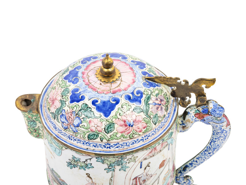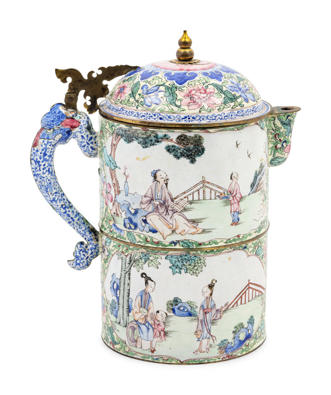 the cylindrical body of two sections, each deftly painted with continuous landscape and figural scenes. The upper section with a closefitting spout, and all surmounted by a domed cover crowned with a gilt finial of double-gourd form and scalloped hinge joining the dragon-head