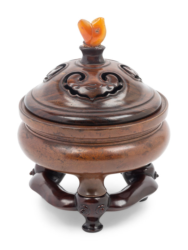 of bombé form with slightly flaring neck with everted rim and tripod feet, together with custom made wood cover and stand.