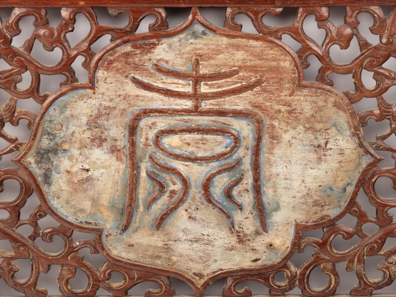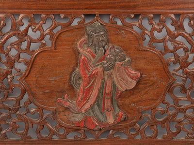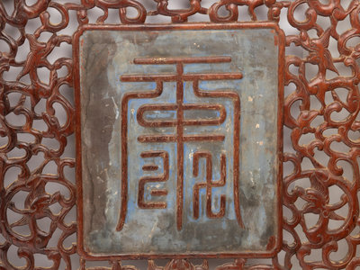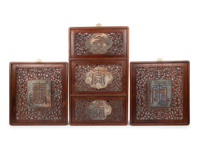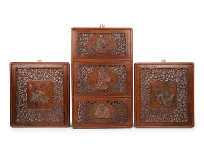 comprising a pair of smaller panels and a large panel, all carved in openwork, with hardstone inlaid immortals to the front and shou characters to the back.