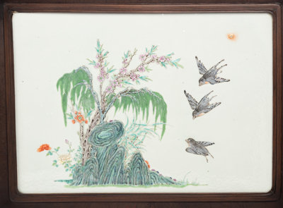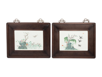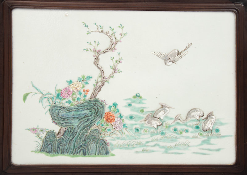 each of rectangular form, molded in low relief and painted to show swallows flying towards willow trees issuing from rockworks, and egrets in a lotus pond, set in a hardwood frame with metal mounts.