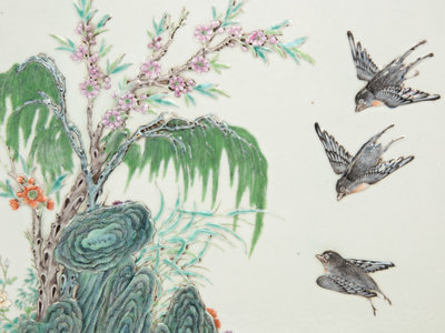 民国-近代 粉彩貼塑蓮塘鷺鷥、桃花春燕瓷挂屏一對