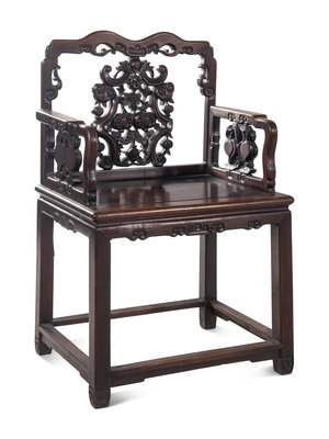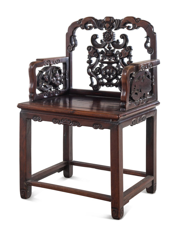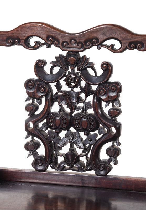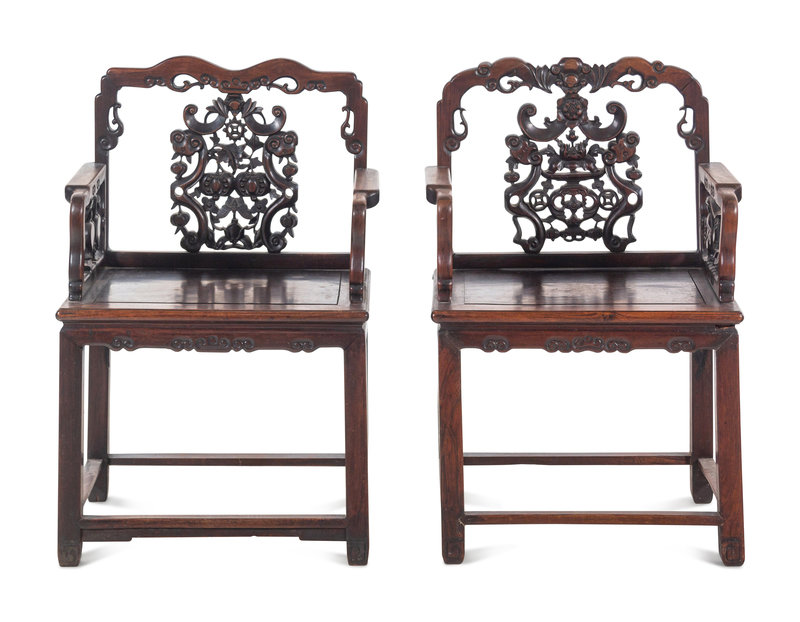 each of rectangular section, having curvilinear crestrail, one worked with a descending bat over an elaborate backsplat reticulated with various pomegranate, butterflies, coins, and a vase between vertical ruyi scepters, supported with further reticulated armrest over the seat set in a metered frame above a cloud scroll apron, supported on four straight legs of square section joined by rails.