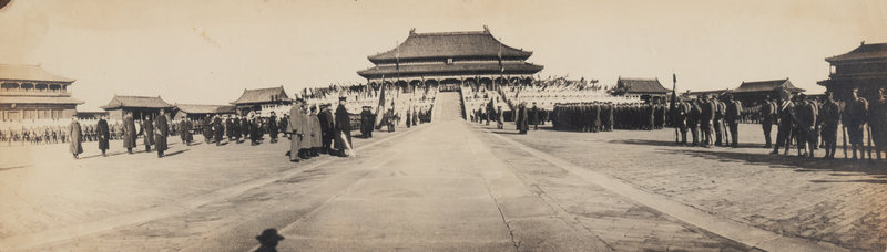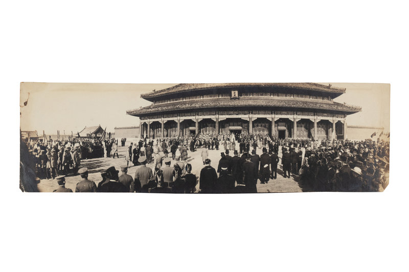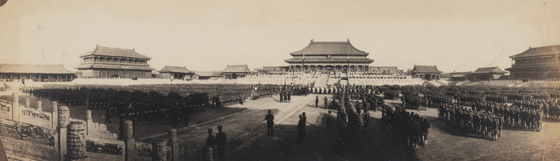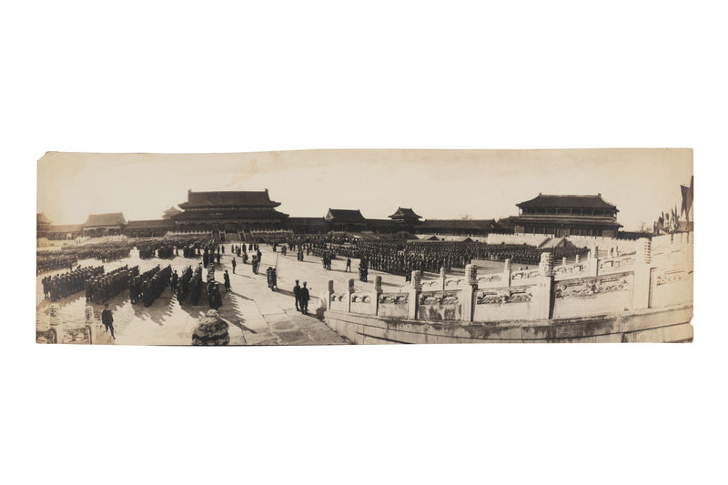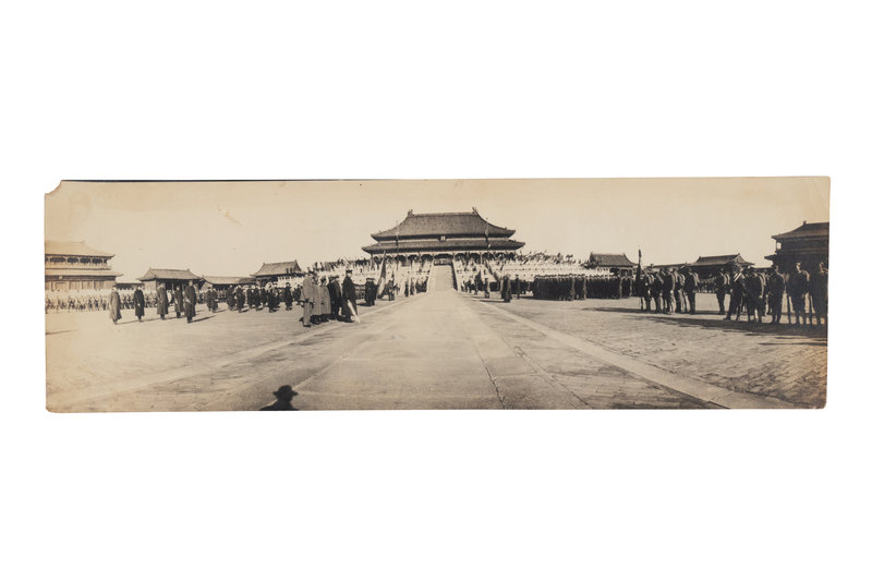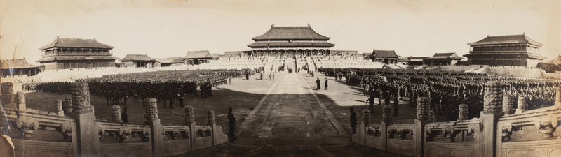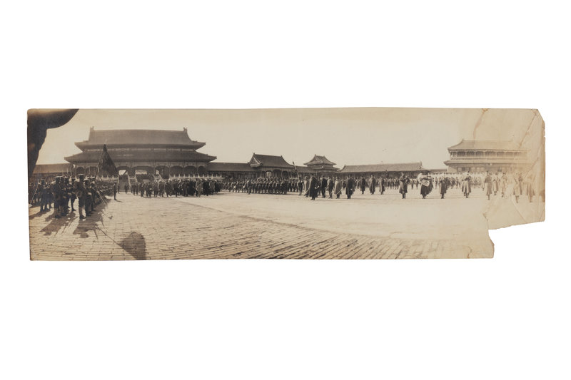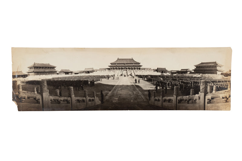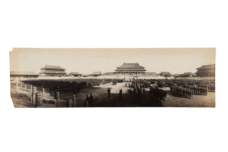 這六張太和殿全景拍攝于庚子囯變之際。自1856年英法聯軍之役後天津條約簽訂,開放通航通商,允許西人深入內地傳教,基督徒的增加引發舊民衆之反感,教案頻出。對於直隸一帶愈演愈烈的私刑暴亂,清廷的態度反復而曖昧——既欲借拳民之力與外洋抗衡,又深畏西方列强的反擊與報復。1900年6月慈禧太后允許義和團進京,成為壓倒駱駝的最後一根稻草,致使英、法、俄、德、日、意、美、奧八國聯合遠征京津。8月15日聯軍攻入紫禁城,帝后倉皇西逃,這六幅相片就是記錄了當年那一刻影像。拍攝者是一位被官兵帶入紫禁城的攝影師。照片清晰度極佳——奏響凱歌的圓號、日本刀上的寒光、將領胸前的徽章,乃至各國的旌旗、列隊、儀態仗,一一可見。現藏家早年間得自攝影師的後人,對於攝影師的名字卻不可追了。流傳百二十年而從未見諸出版,縱有邊角小瑕,也不能掩蓋其珍貴的歷史涵義與收藏價值。