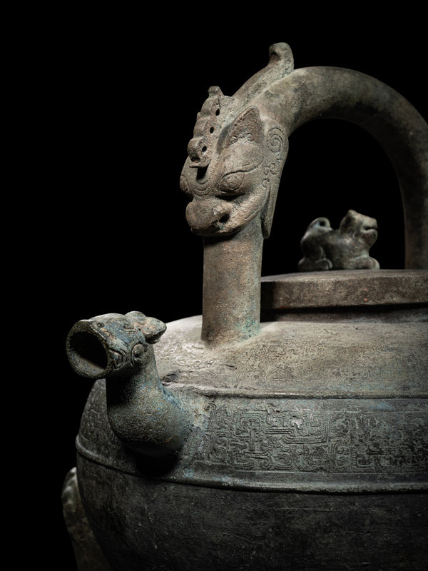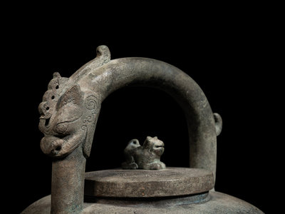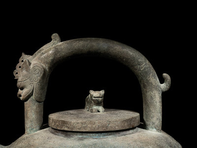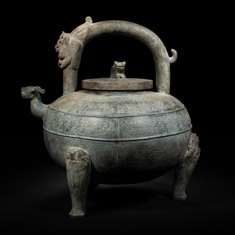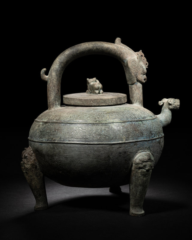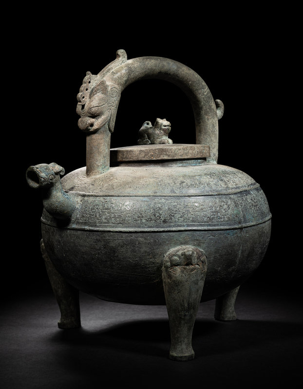 the compressed globular body cast nestled within three club legs terminating in curved feet, the shoulder with a pair of beaded bands about the shoulder reserving a zoomorphic scroll against a leiwen ground interrupted with a serpentine spout, and surmounted by a large dragon head handle arching over the lion topped finial to the disc-like cover. The whole showing grey patina and faint azure encrustation.