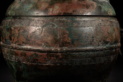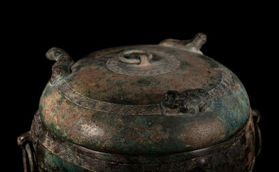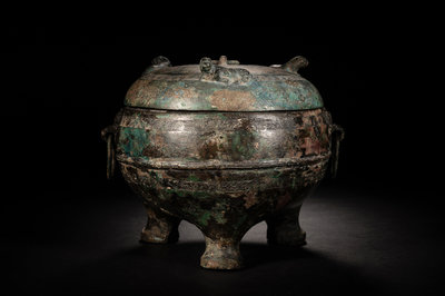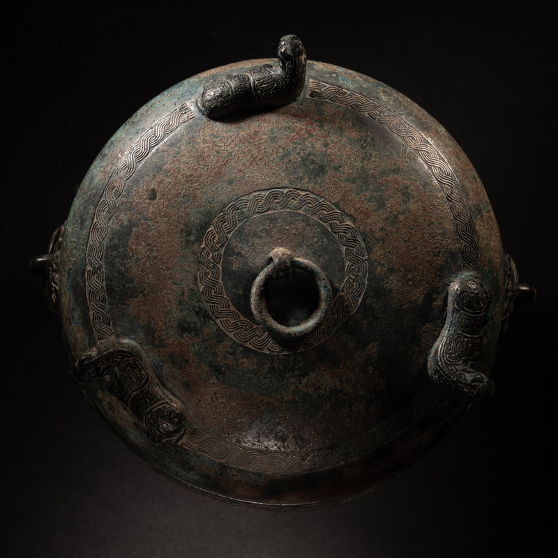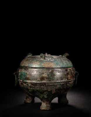 having a globular body cast over low squat legs, the wide mouth fit with a conforming cover cast with three recumbent beasts. The body cast with braided rings alternating a raised lip, flanked with animal mask handles suspending loop handles. The vessel and cover showing deep patina with ochre and malachite encrustations.