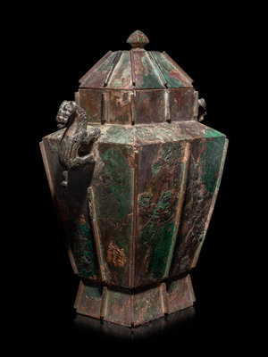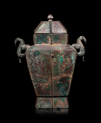 the four-sided vessel and conforming cover of square form, with plain lineal flanges bisecting each face and running the length of the corners, all meeting at the top of the cover beneath a pointed finial. The shoulders cast with opposing dragon-form handles, all with malachite, brown, and ochre encrustations.