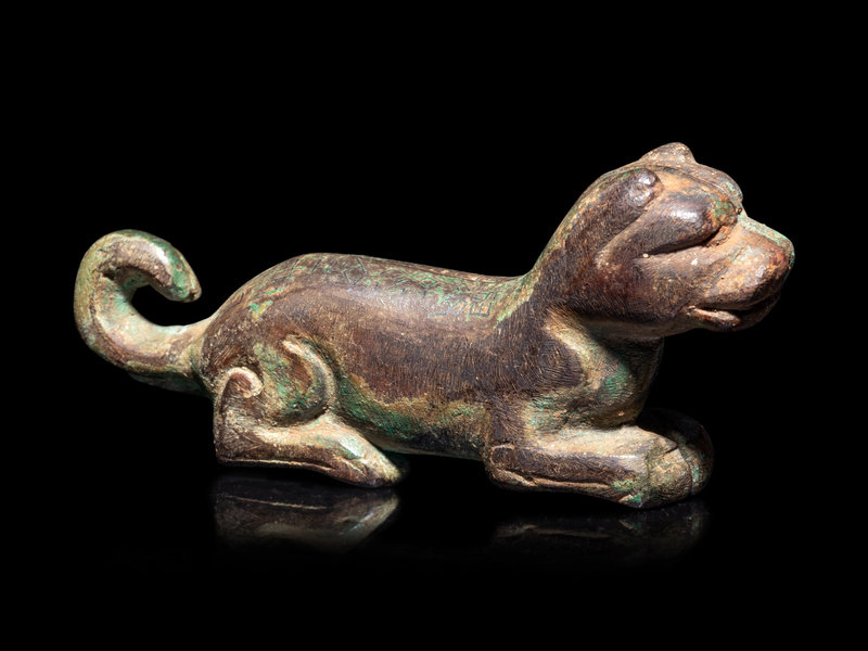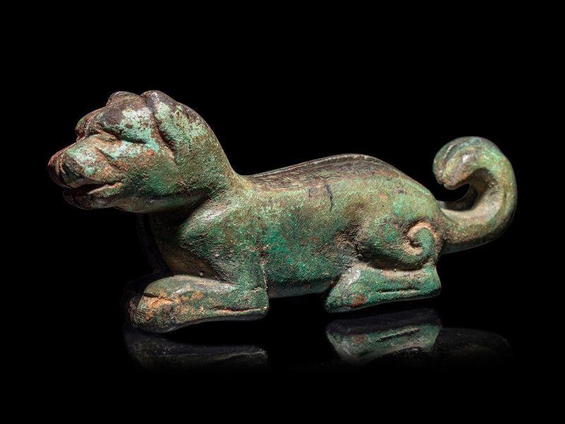 cast a recumbent beast with lively expression bisected vertically along the spine into two conforming halves, bearing an inscription down the dorsal side.
