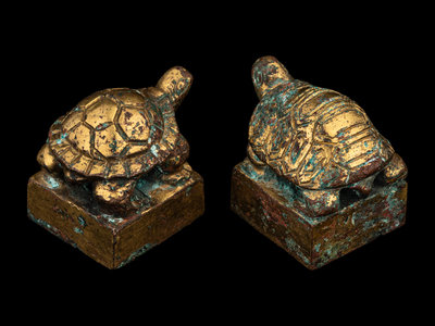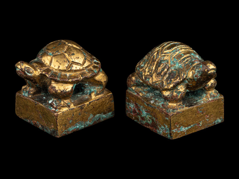 each surmounted by a turtle finial, the first seal face incised with jin jun hou yin, the second, Zhao Zhang sima.
