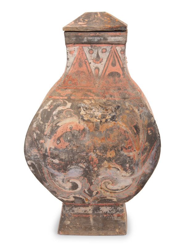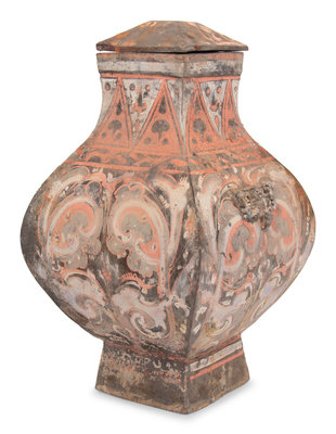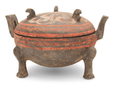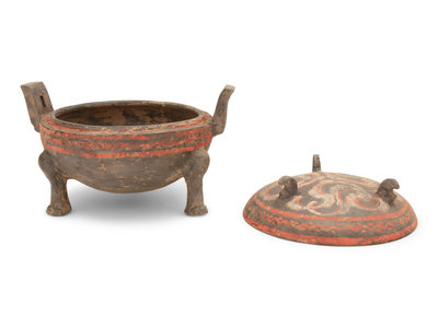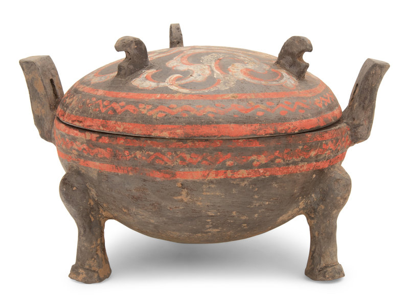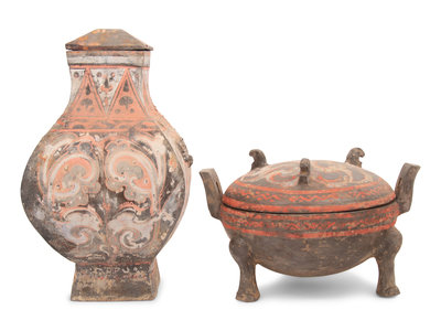 comprising a vase, hu, painted with scrolling white and red designs, and a squat tripd vessel and cover.