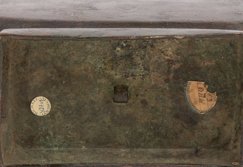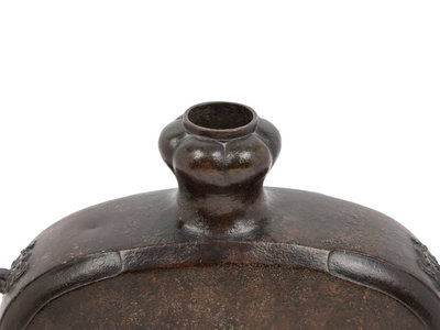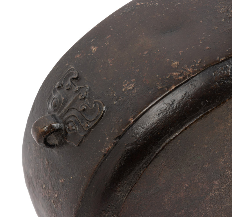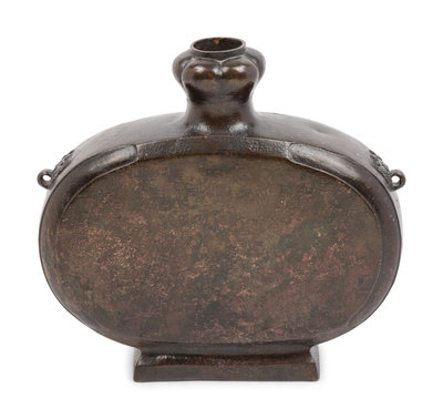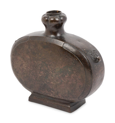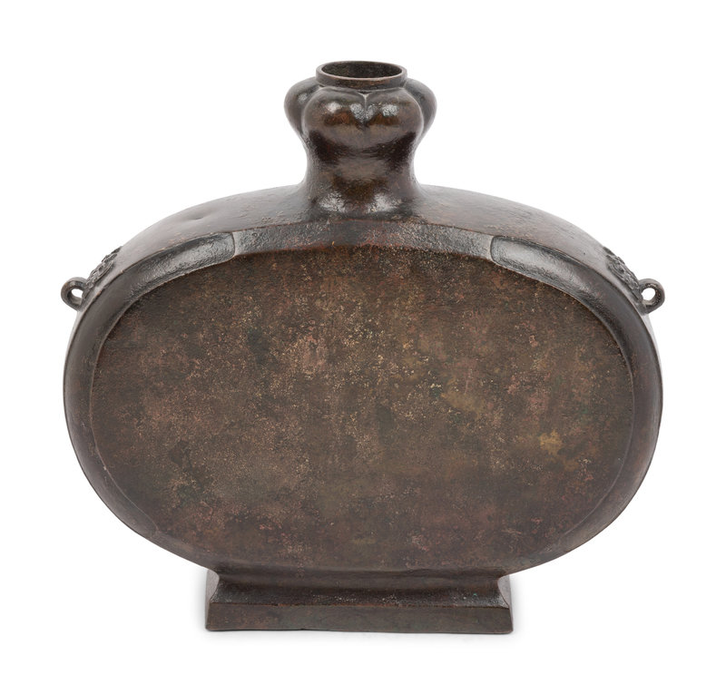 the body of compressed flask form set over a slightly splayed foot, and rising to a stout neck supporting a mouth in the form of lobed bulb of garlic. The smooth broad sides incised with shallow arching recessed panels flanking narrow sides mounted at each shoulder with well-molded taotie masks above vertical band rings.