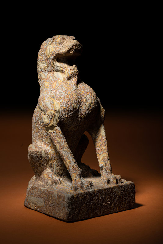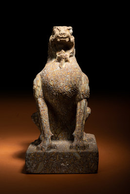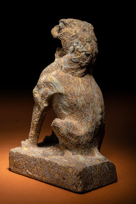 carved seated facing forward and with front legs stiffly braced on the rectangular base, the face carved with a fierce expression, mouth open in a roar.