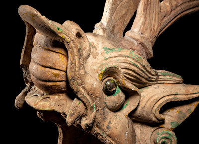 carved as horned dragons with the heads raised and mane flying, glazed in green and yellow.