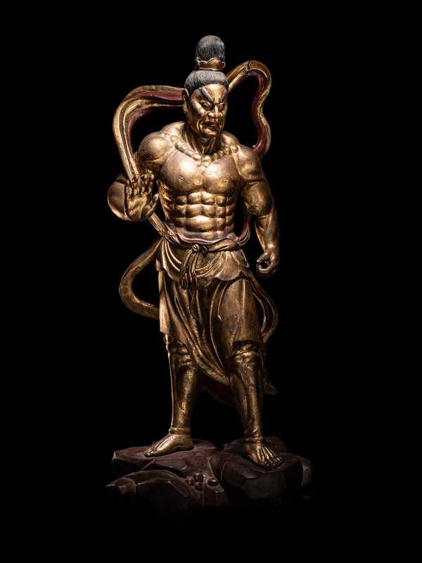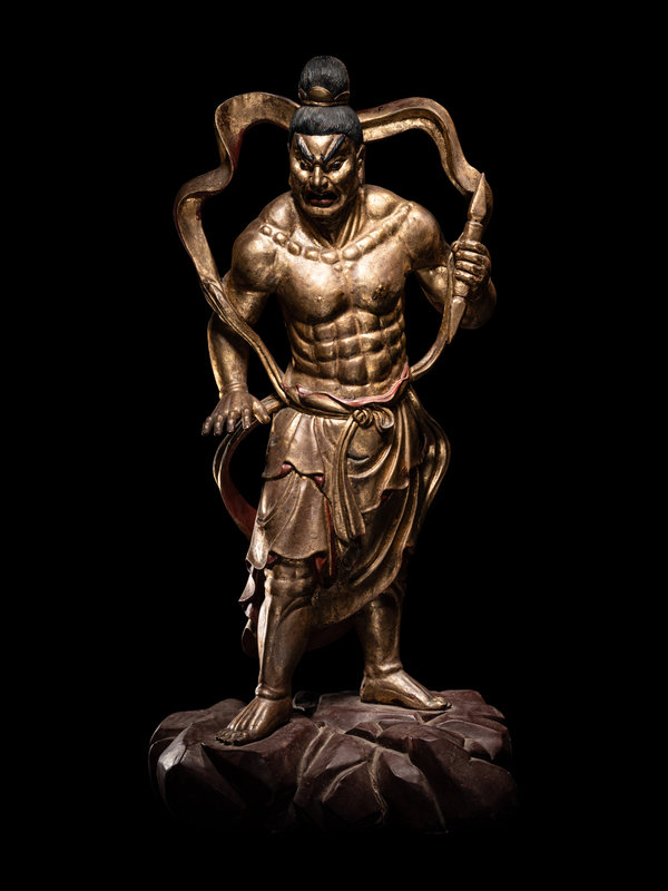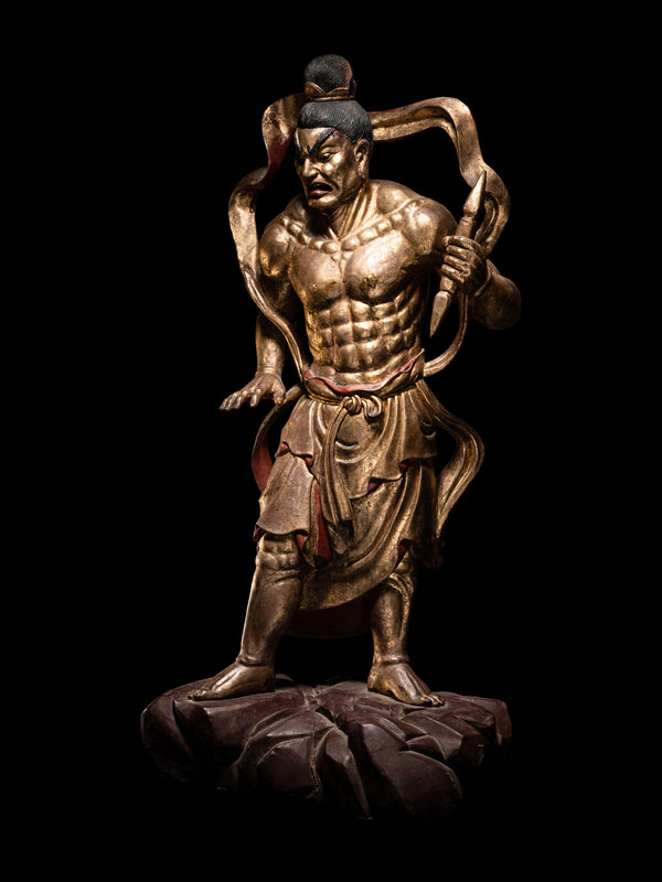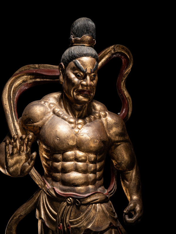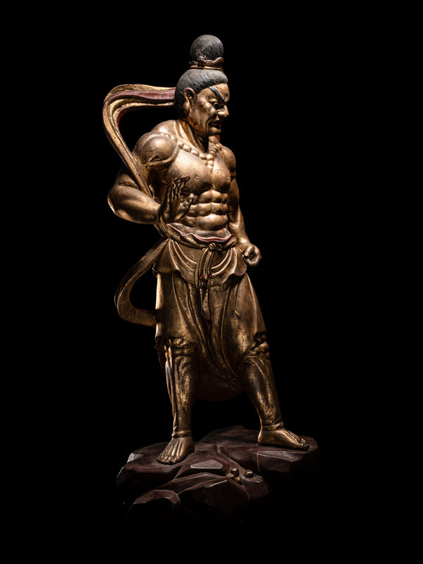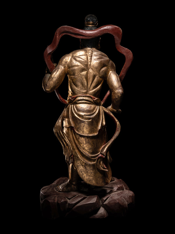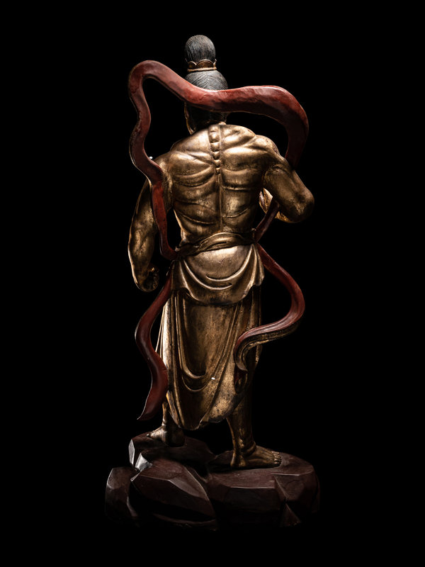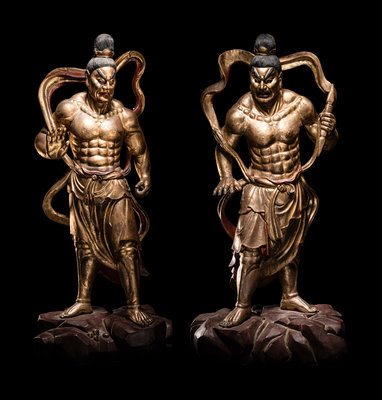each braced for action above a red lacquered craggy rock base, clocked in draping garments fastened at the waist with long sashes upswept about the muscular shoulders to reveal bare chiseled torsos. Each with a fierce grimace beneath highly arched painted eyebrows, and black hair tidily secured with a simple crown.