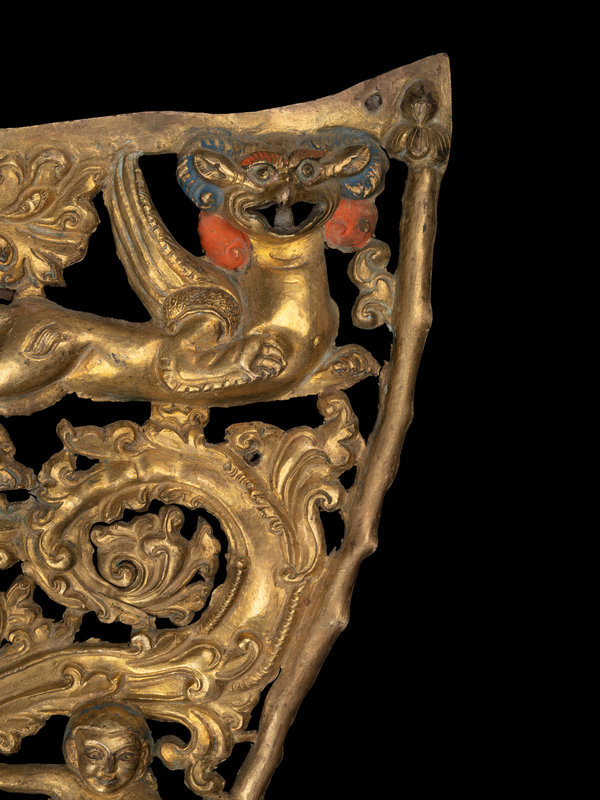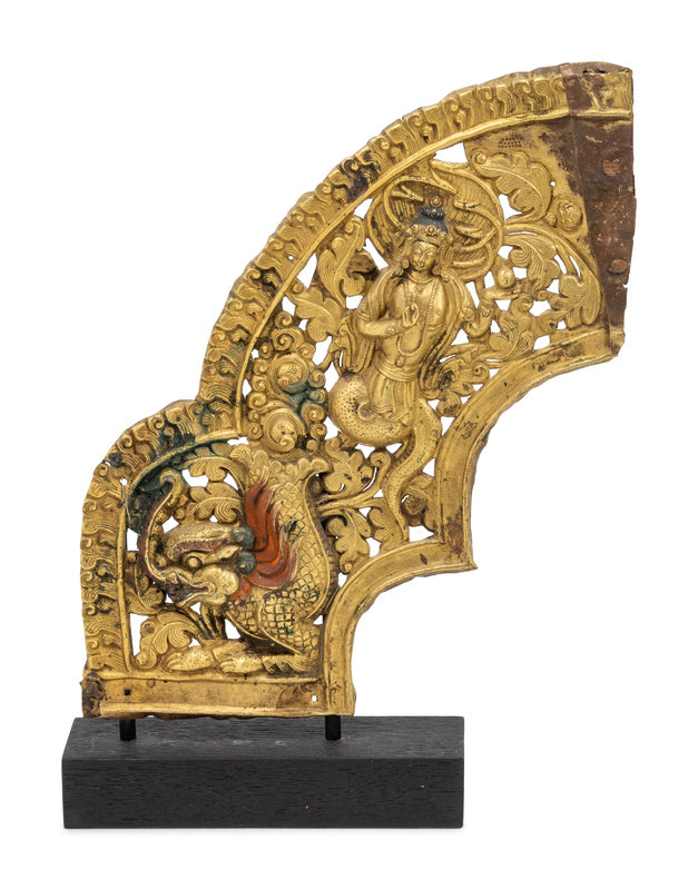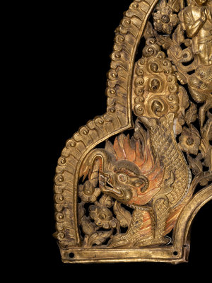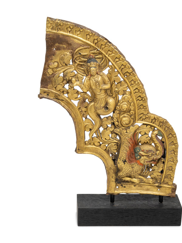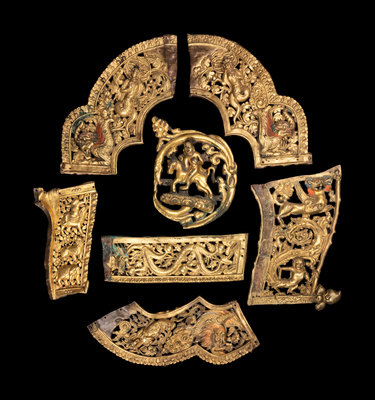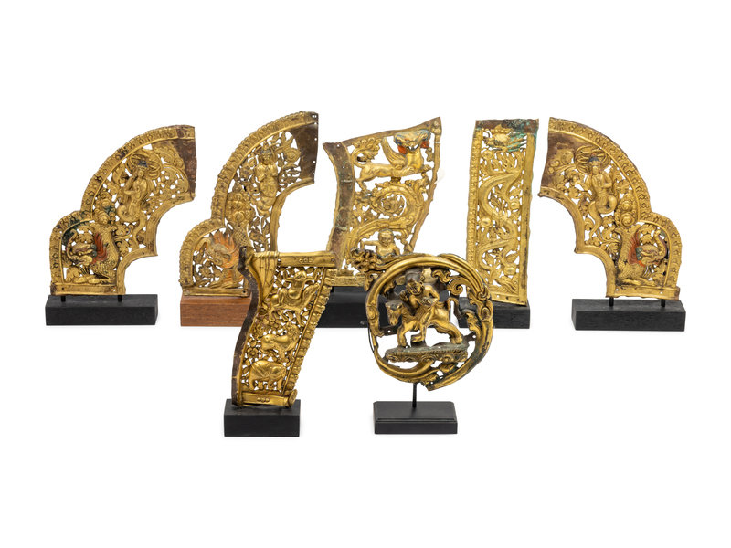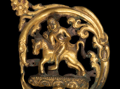 comprised of 7 parts, including a central medallion representing a deity on a horse upon a lotus, encircled by a foliate form; additional parts representing animal and mythological humanoid figures among flowers and foliage.