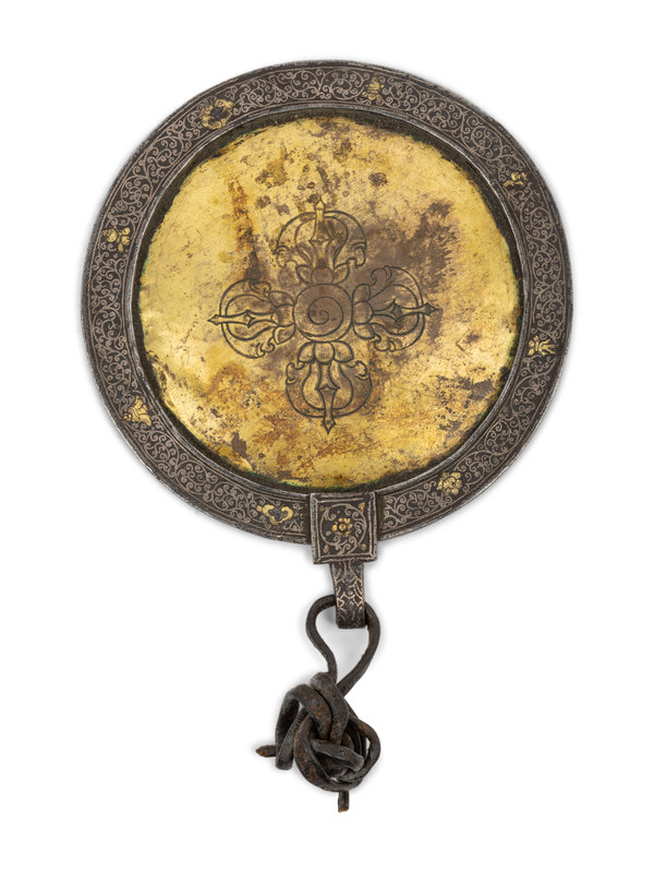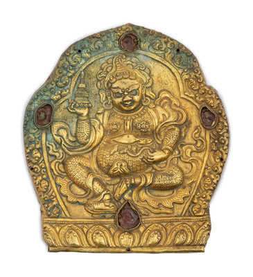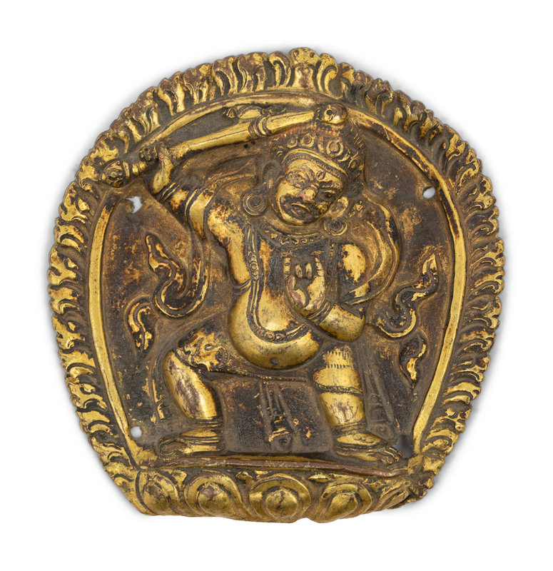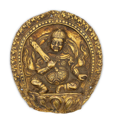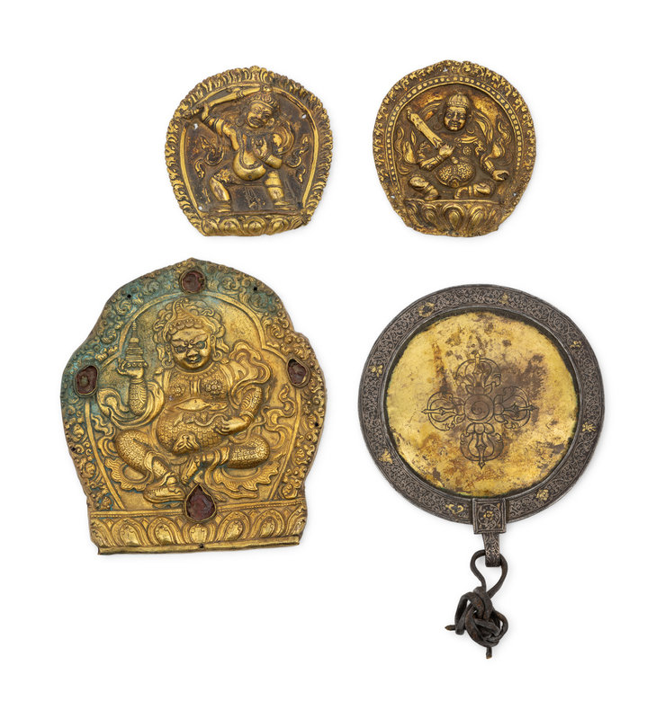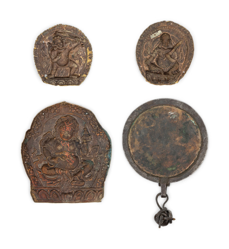 the first representing a wrathful deity standing in alidhasana, holding a sword in the upraised right hand and apanamudra in the left, amid a ground with swirling motif; the second representing a deity seated in lalitasana holding a sword across the body and wearing a billowing scarf; the third seated in lalitasana holding a bell and a snake upon a lotus and within a trefoil form; the fourth representing an incised double vajra form within a bronze frame having a foliate pattern.
