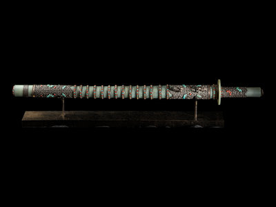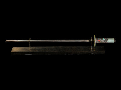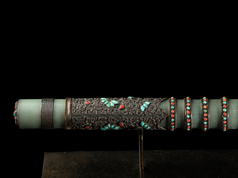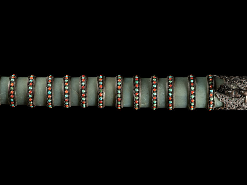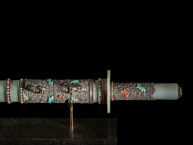 the double edged blade tapering to a blunt tip, the chased silver hilt having a celadon jade bi disc as a guard, further mounted with a smooth ring at the handle with a coral inset floriform pommel mounted with a ring. The scabbard comprised of numerous jade bands between silver rings inset with petite turquoise and coral cabochons, and mounted with dragon-head masks suspending loop rings. The whole raised on a modern display stand.