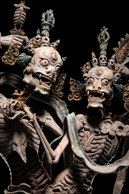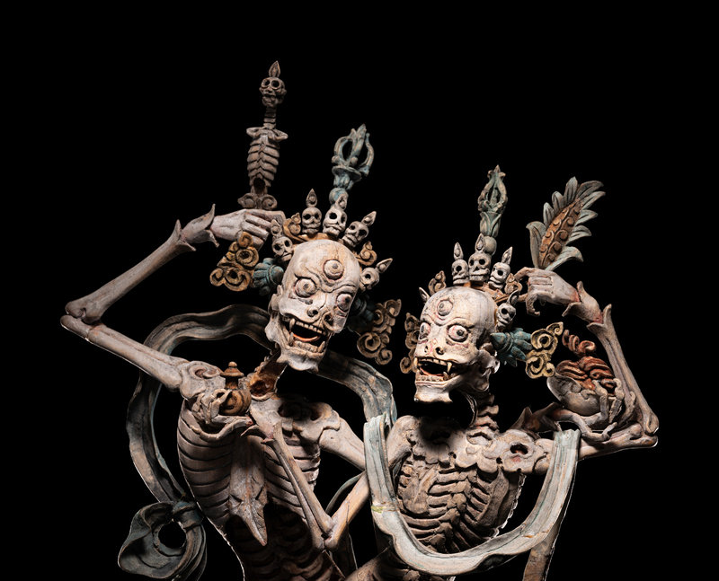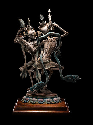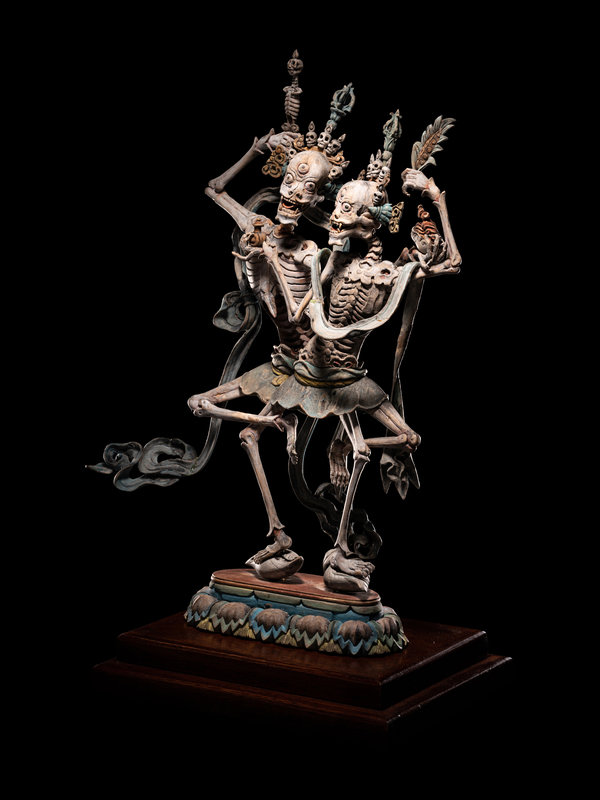 finely worked to show the two skeletal protectors shown in ardhaparyankasana with arms embraced and knees intertwined, creating a mirror image of eachother while balanced on conch and cowrie shells, all while holding ritual implements aloft. Each having a third eye, and wide toothy smile, shown wearing a crown of five skulls and draped in a weightless billowing sash. The whole raised above a lotus lappet pedestal and later hardwood stand.