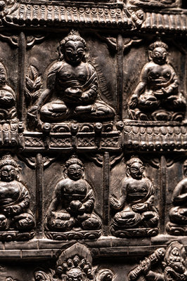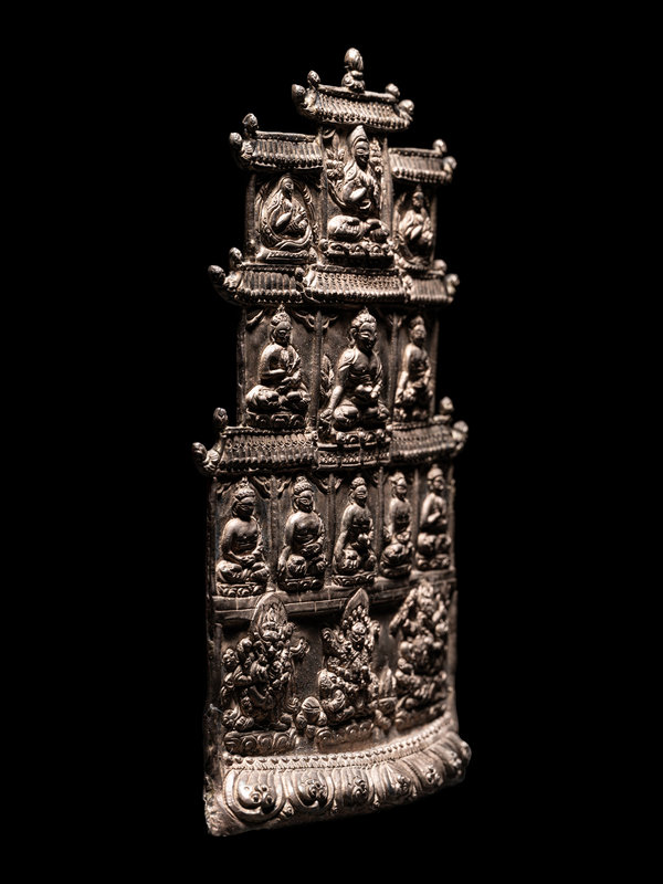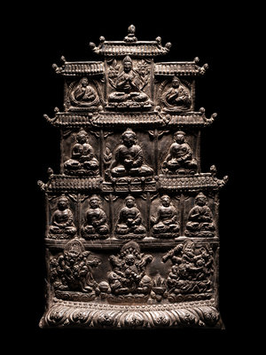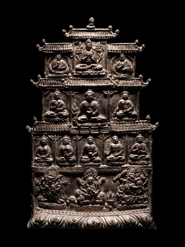 of tiered form having a curved recto and verso with pointed corners, depicting fourteen deities in four registers; at bottom, three wrathful deities surmounted by eight peaceful figures holding alms bowls, further surmounted by a central figure of a lama wearing a pandita hat; the registers framed by architectural elements resembling a pagoda roof, having a lotus base.