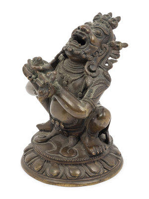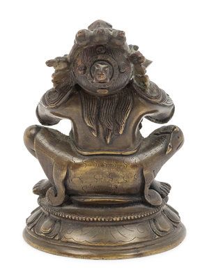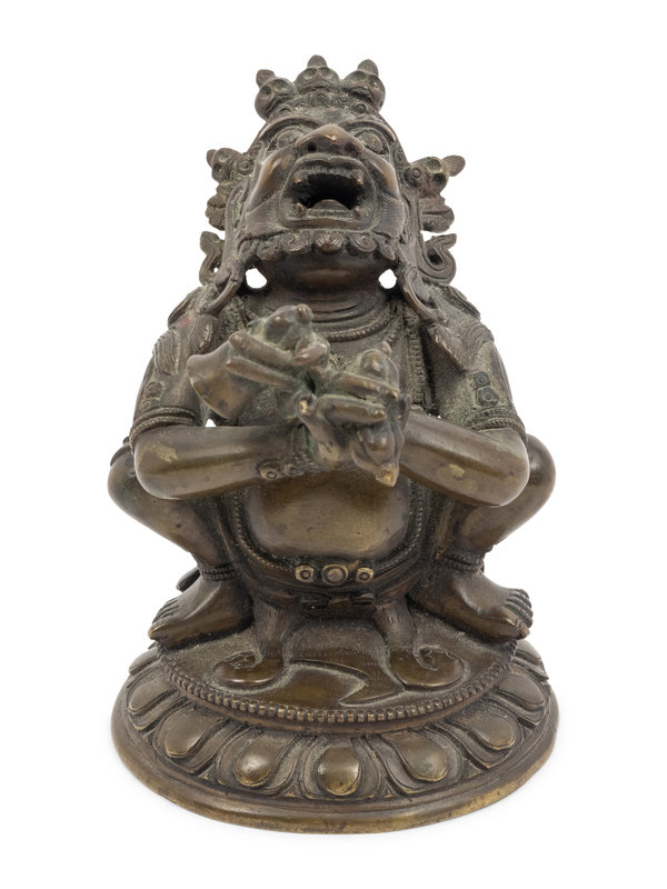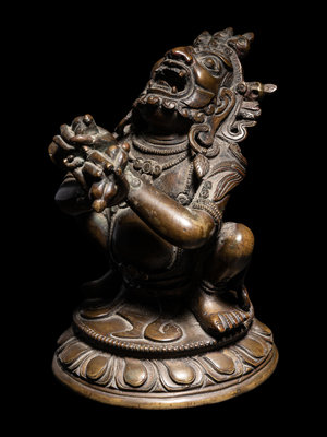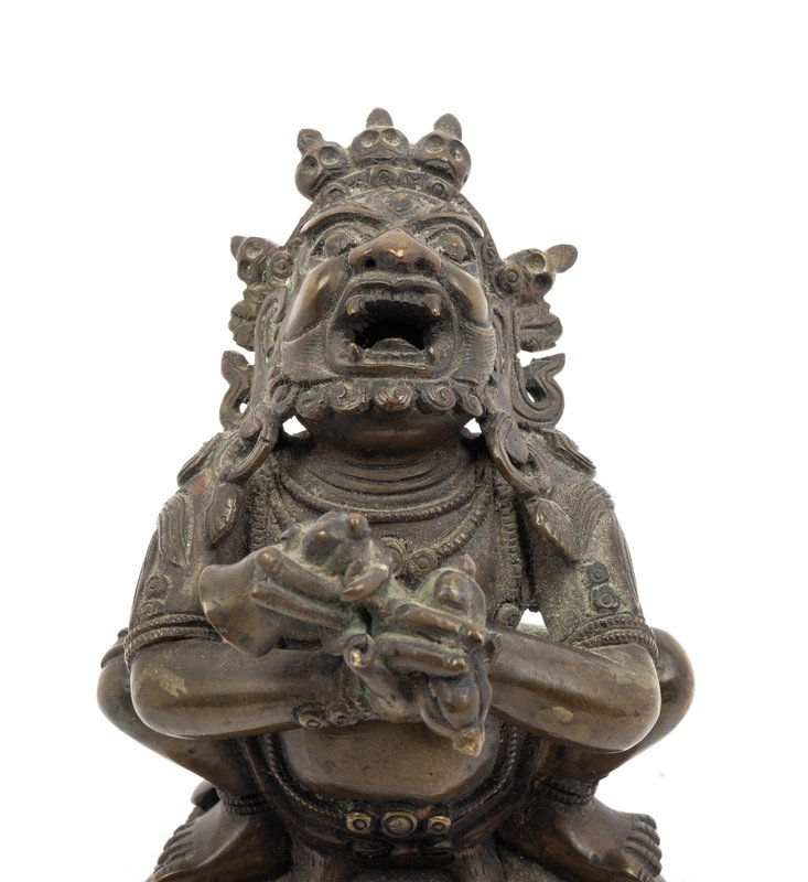 cast seated in a low squat upon a lotus base with head thrown back and baring sharpened teeth; figure having arms crossed in front of torso, hands in vajrahumkara mudra holding a vajra and a bell. The deity adorned with jewels, a loincloth, and a skull tiara.