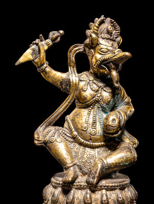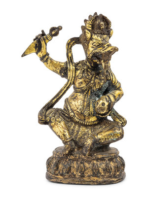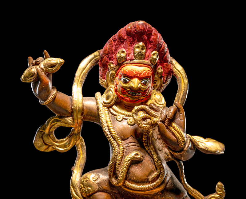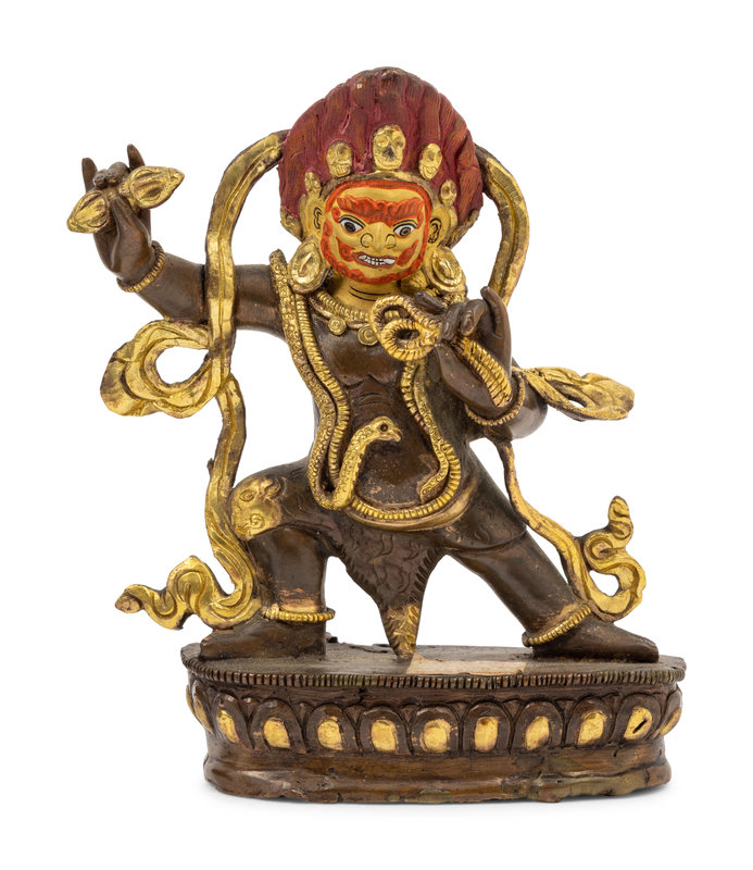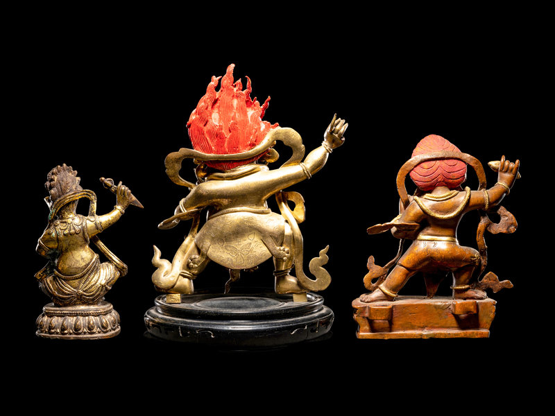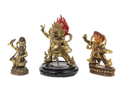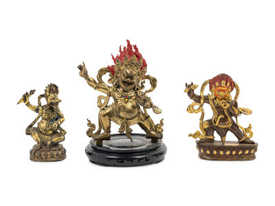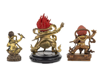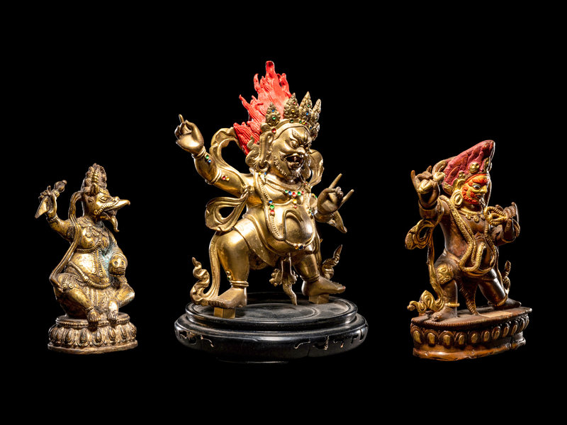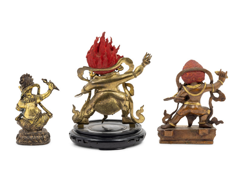the first representing Garuda, the bird- headed deity shown open-beaked grasping a snake, adorned in jewelry and seated upon a lotus base; the second representing Mahakala posed in alidhasana wearing a tiara and jewelry inset with stones and flames emerging from his crown; the third representing Vajrapani in alidhasana holding a vajra and having a red-enameled beard and hat, wearing a skull tiara.