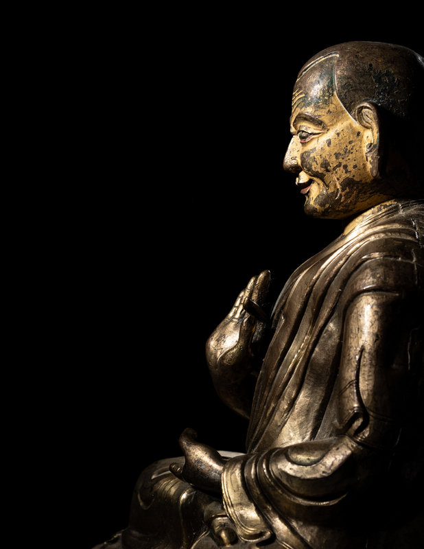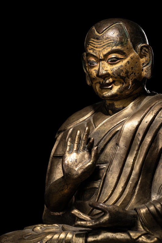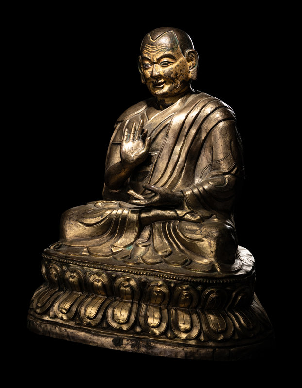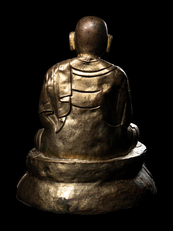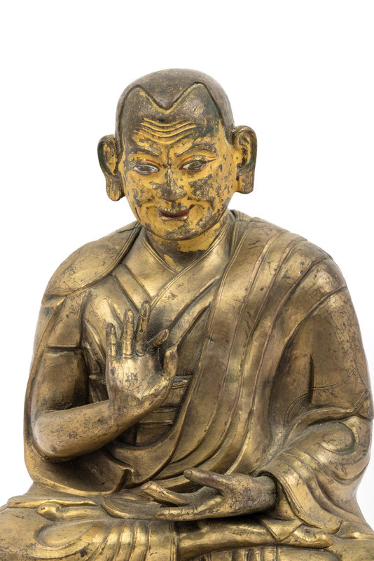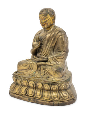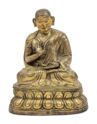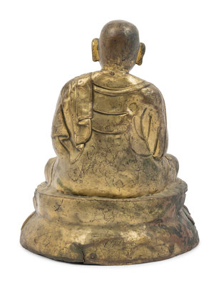 A Large Tibetan Parcel Gilt Bronze Repoussé Figure of a Seated Monk