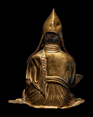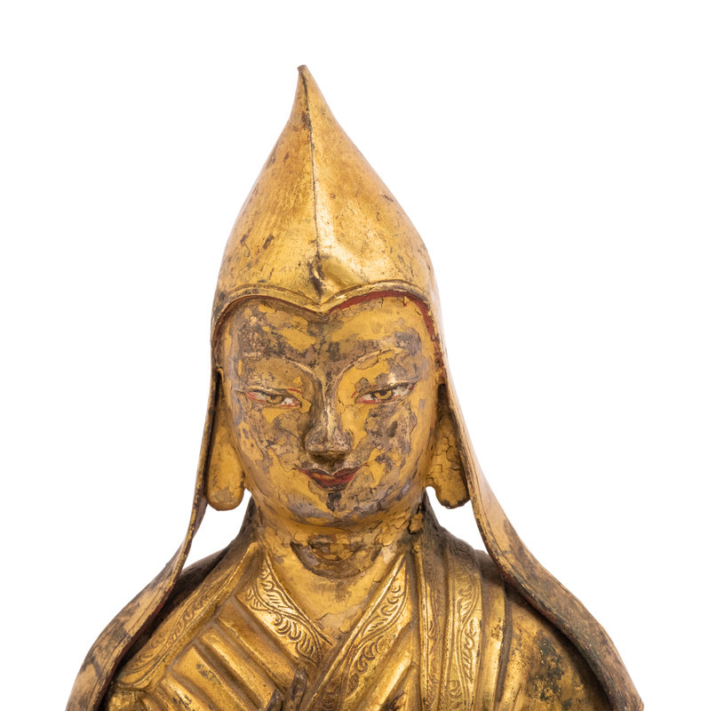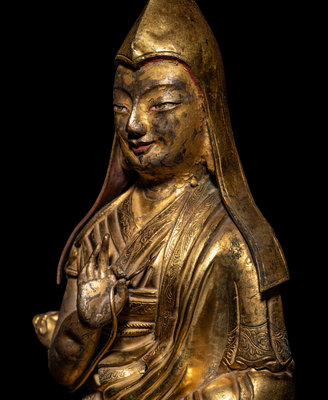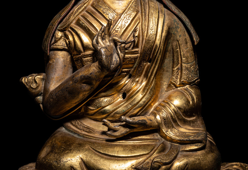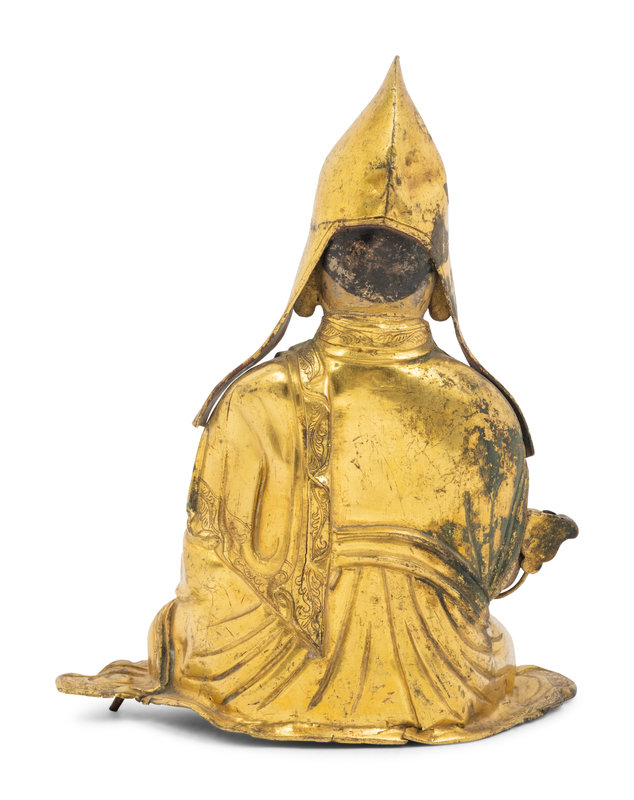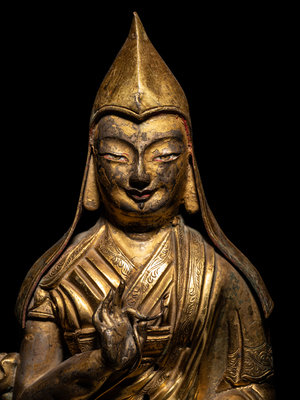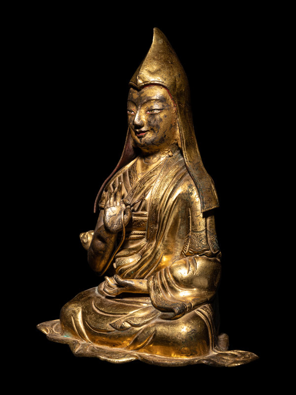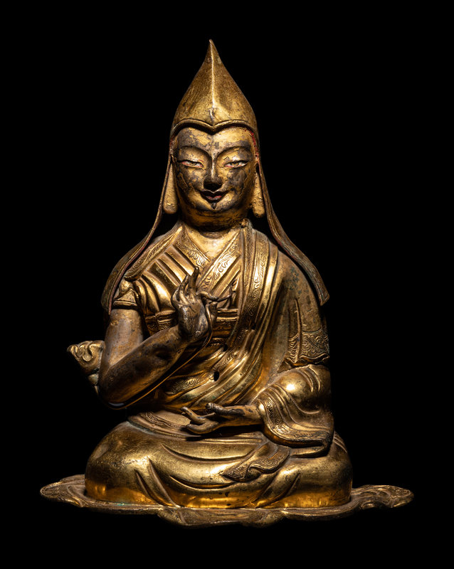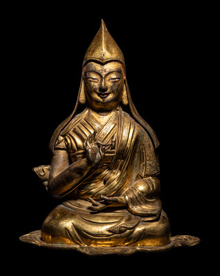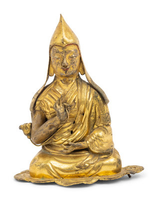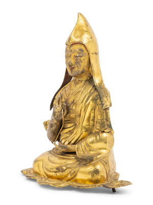 A Tibetan Gilt Bronze Repoussé Seated Figure of Tsongkhapa