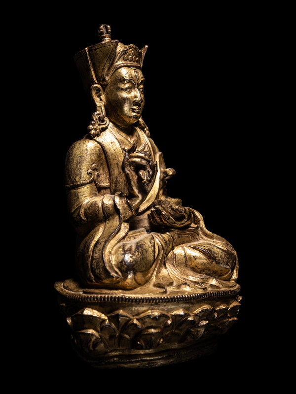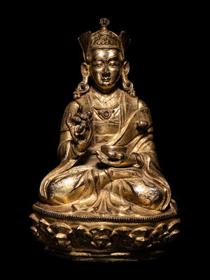 seated in dhyanasana upon a lotus base, with his left hand in shunimudra and holding a vajra, the other hand resting in his lap holding an alms bowl; the figure shown wearing monastic garb.