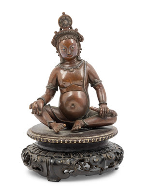seated with legs arranged in front of a plump torso, holding a mongoose in the left hand and a fruit in the right; adorned with simple jewelry and having a raised floral motif extending from a crown; having traces of red pigment in eyes and mouth; raised upon a later Chinese hardwood stand.