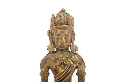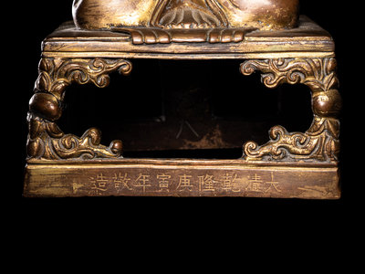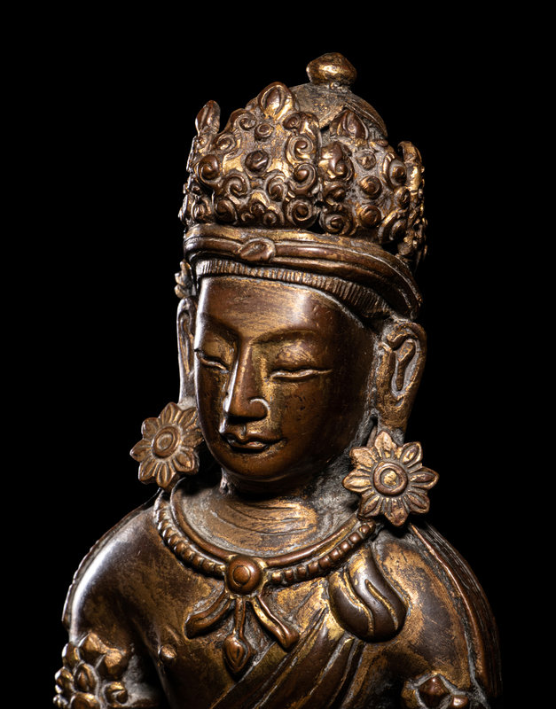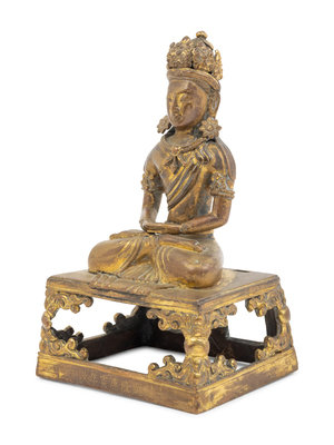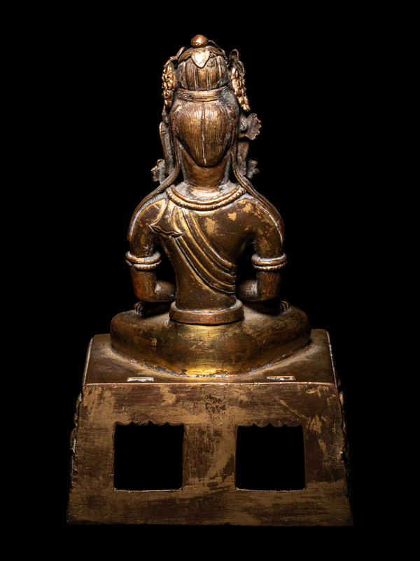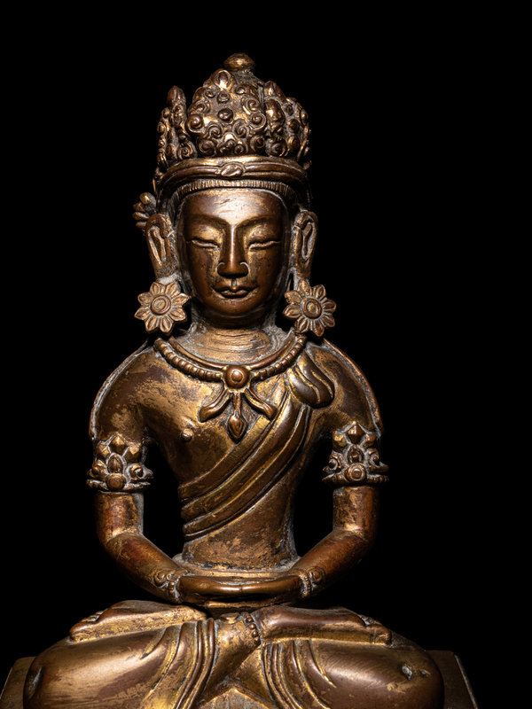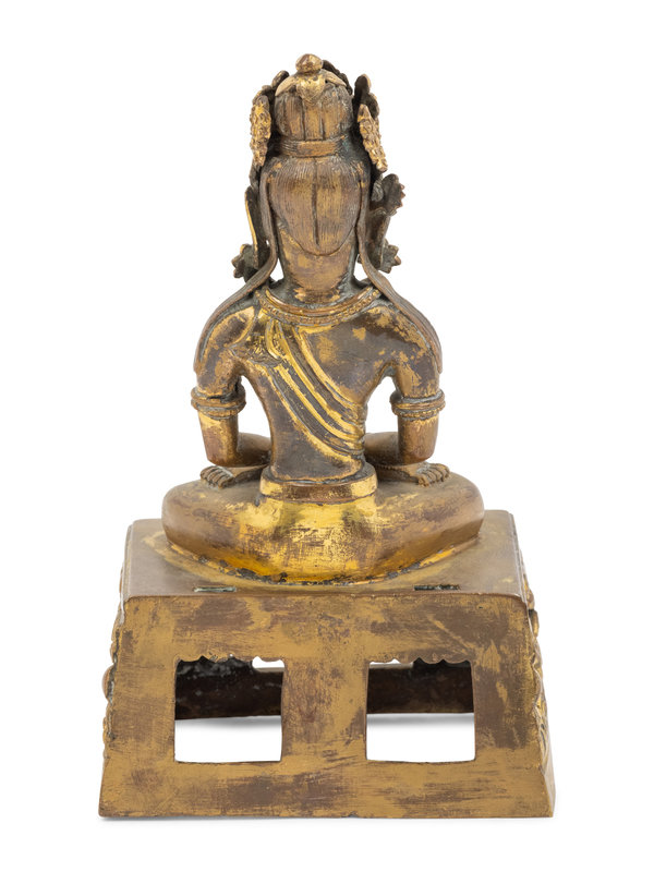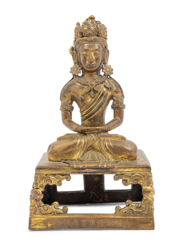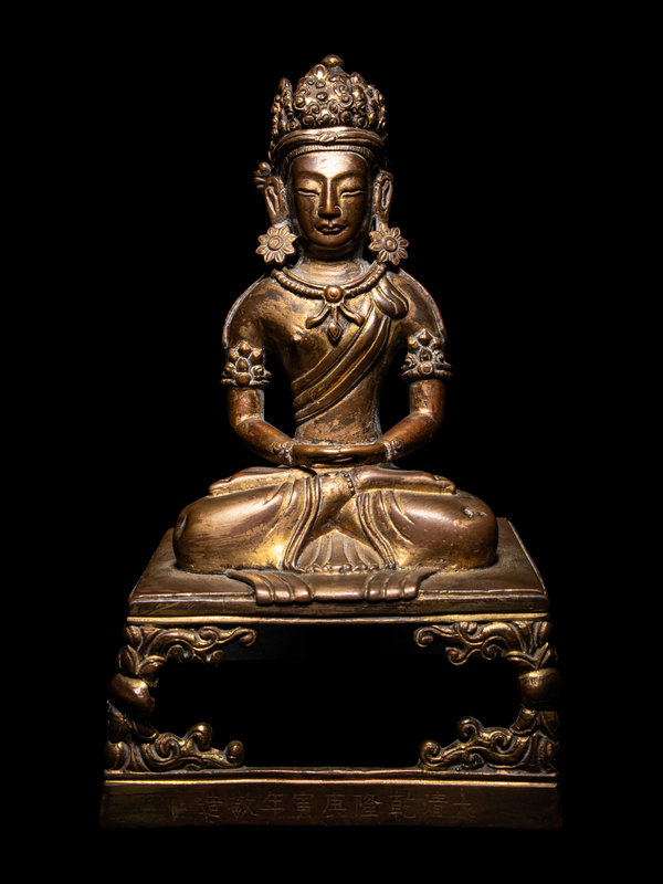 seated in dhayanasana with palms resting upright in dhyanamudra, the peaceful deity having sloped shoulders and a narrow waist, eyes closed beneath an ornate tiara; atop a rectangular base with curling details, with inscription on lowest horizontal portion.