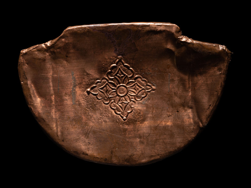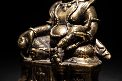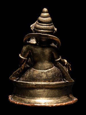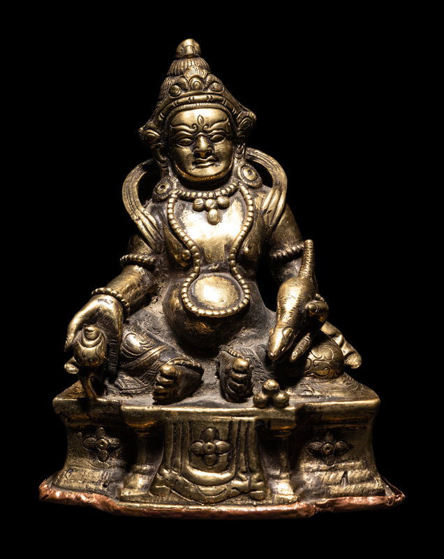 seated in a relaxed posture with legs loosely extending in front of a rounded torso, holding a fruit in the right hand and a mongoose in the left; draped in jewels and wearing an ornately decorated robe and hat; resting upon a detailed pedestal with a repoussé copper base.