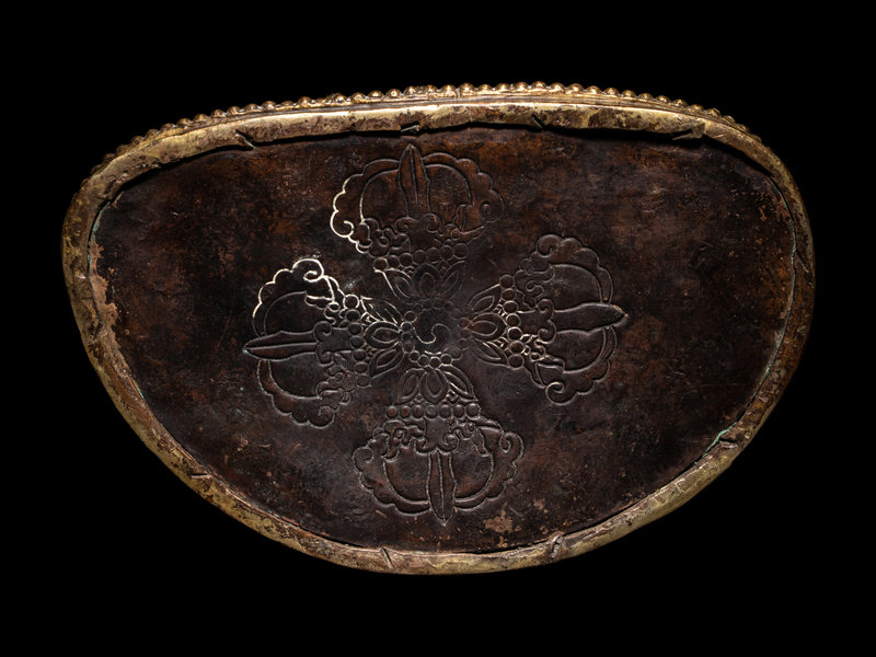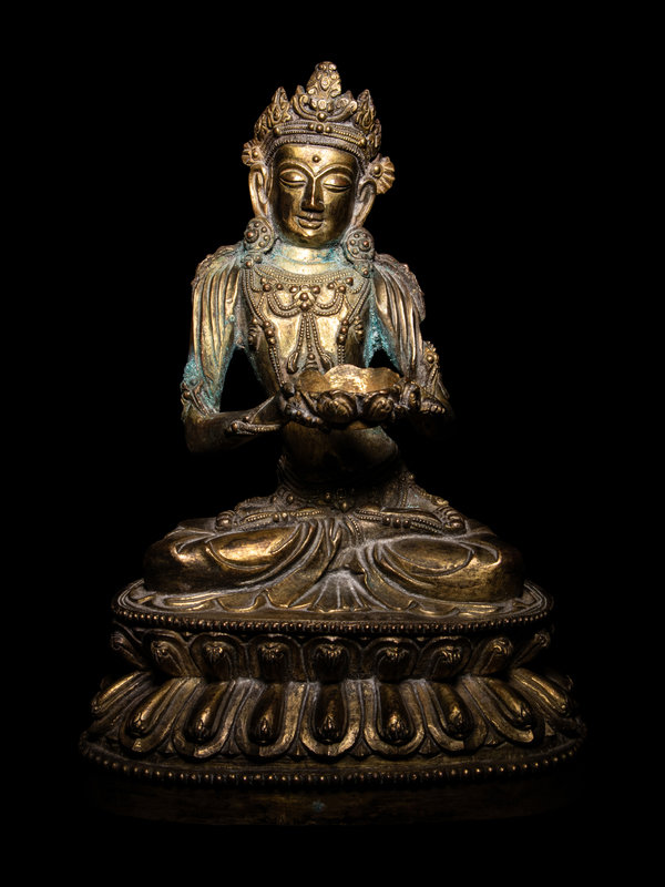 seated in dhyanasana, holding a lotus-form bowl, adorned in jewelry and draped robes; the face having a square jaw and bearing a peaceful expression with eyes drawn closed; resting atop a double lotus plinth inscribed with an apocryphal Yongle mark on the upper portion.