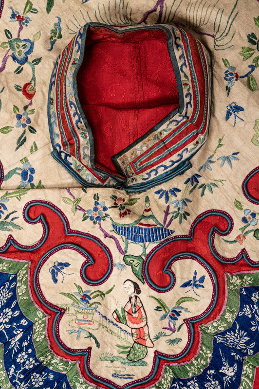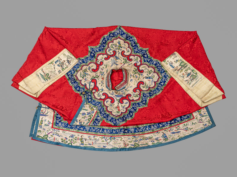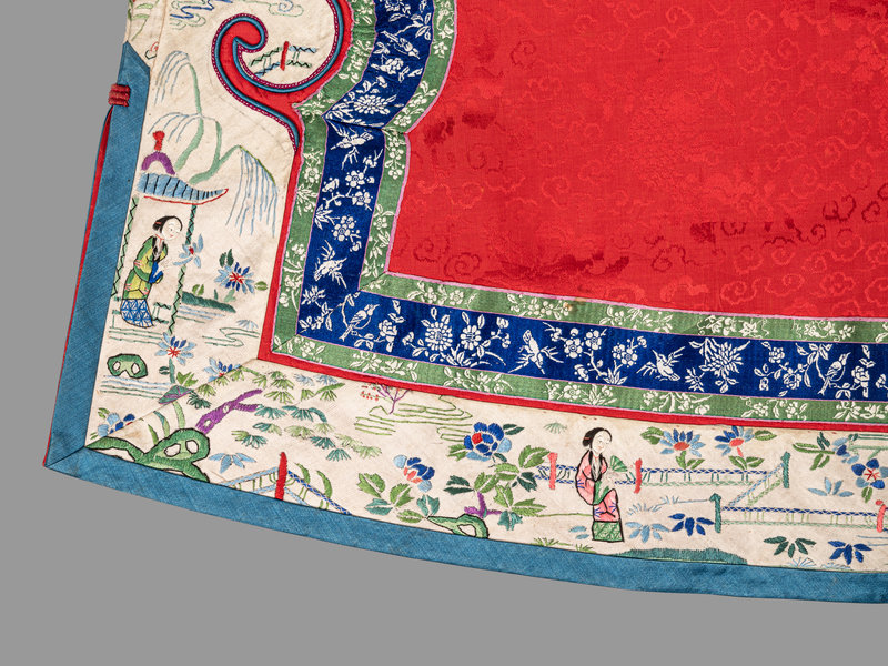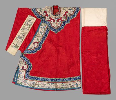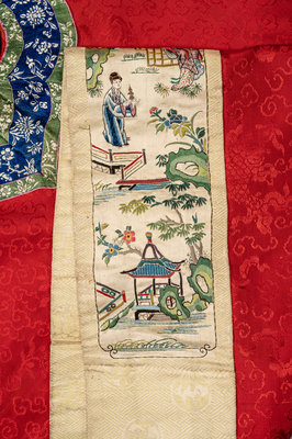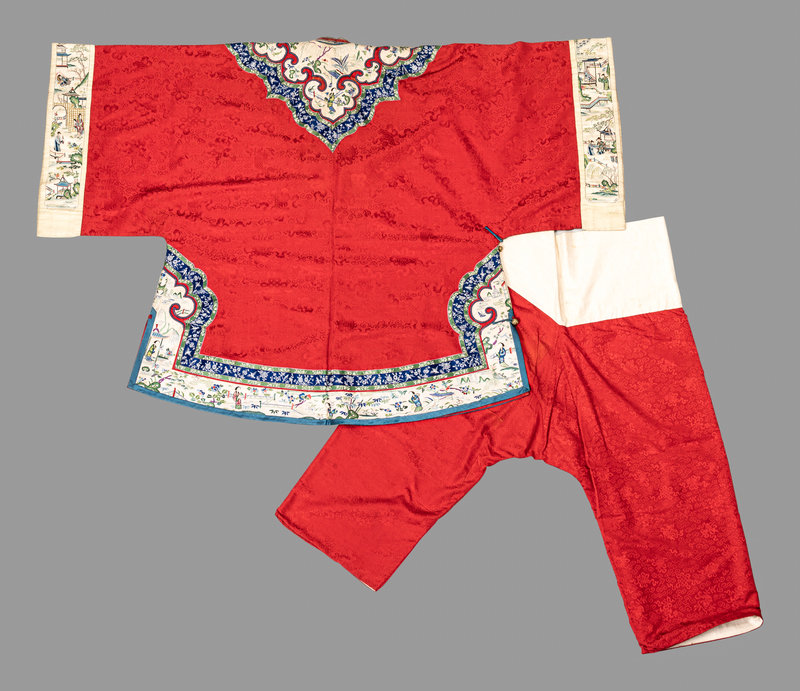 the wide jacket constructed of a red damask woven with a pattern of scrolling clouds, having large open sleeves terminating in cream satin cuffs. The high neck finished with an elaborate cream ground octafoil cloud collar embroidered with ladies in verdant landscapes borders in green and red ribbon, with en suite borders at the side closure, vents, and hem, finished gilt toggle buttons. The pants worked of the same red ground and having a wide waist band.