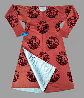 the yardage finely woven repeating roundels showing craggy rockwork with flowering outgrowth tailored with narrow sleeves terminating in a horseshoe cuffs, a side toggle closure, and split hem, all lined in pale blue silk of plain weave.