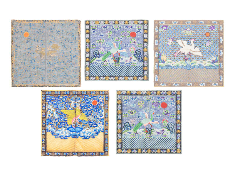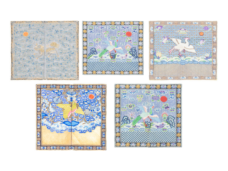 the rank badges comprising a kesi example, a summer gauze example, a pair and an individual embroidered silk examples. Together with three pairs of sleeve bands and two rectangular examples.