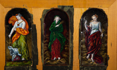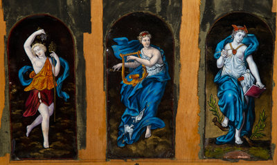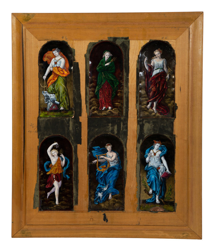 Six Mounted Limoges Enamel Panels Depicting Greek Deities