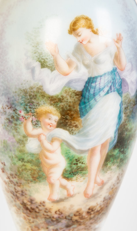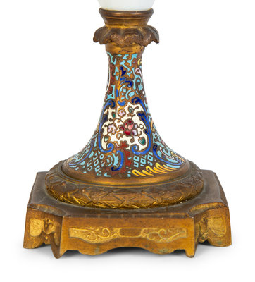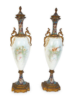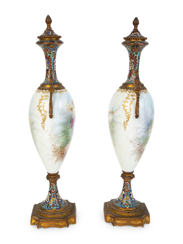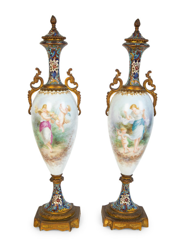 A Pair of Sevres Porcelain and Champleve Gilt Bronze Mounted Vases